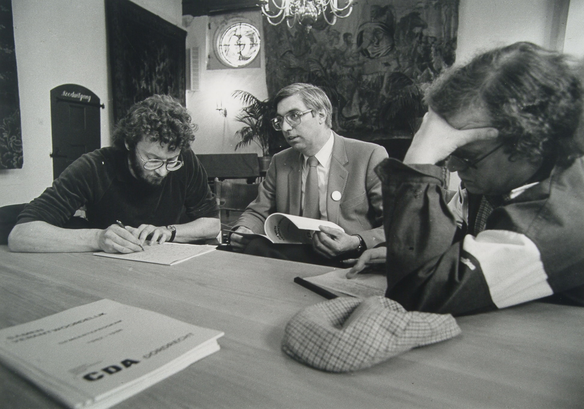 - Gemeenteraadsverkiezingen mei 1982. C. de Kovel, lijsttrekker CDA, na de uitreiking van het gemeenteprogramma in het Hof in gesprek met links Hans Berrevoets van de Dordtenaar en rechts Gertjan van Wijk van het Vrije Volk