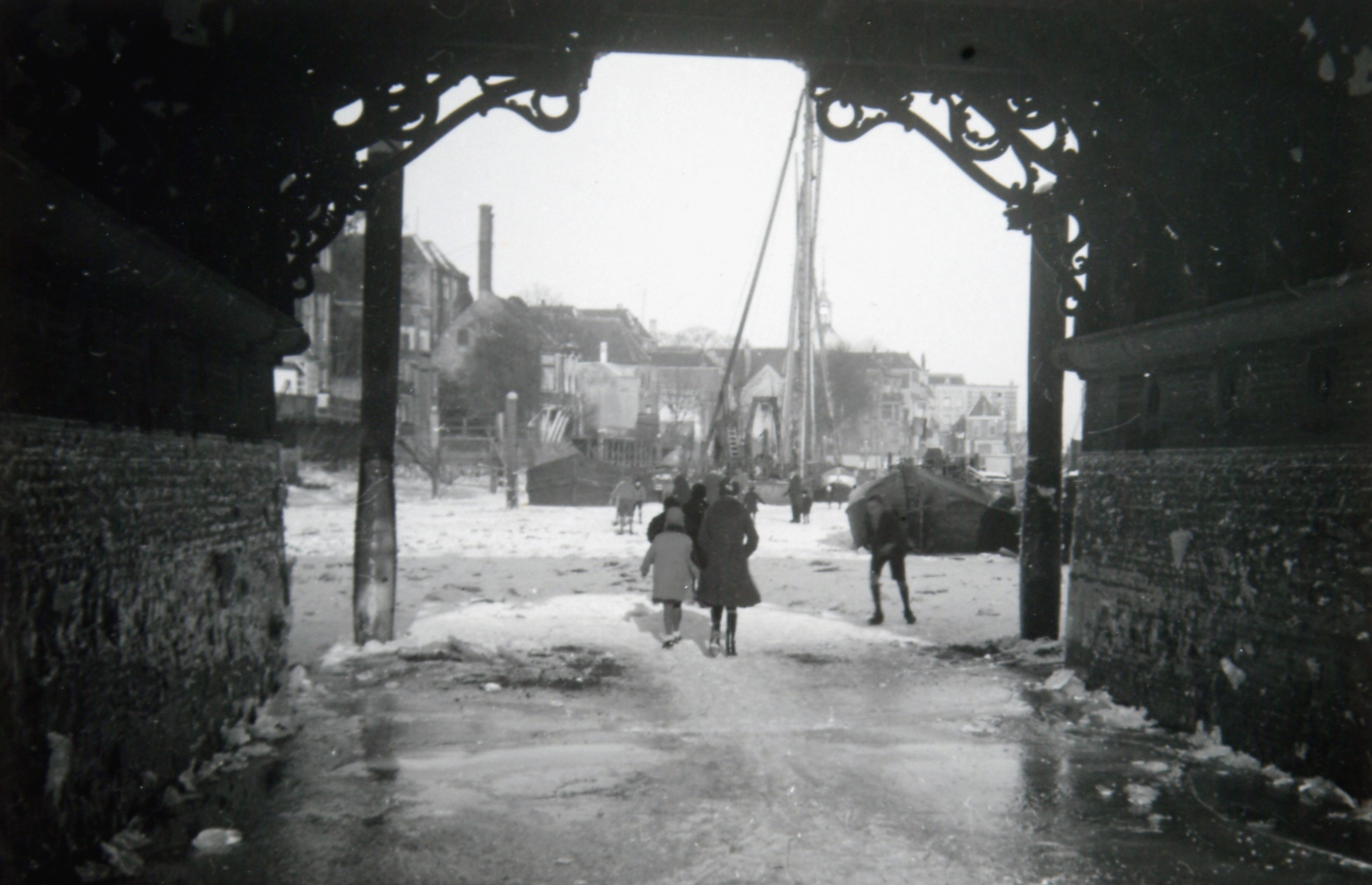 - Dichtgevroren Wijnhaven gezien vanonder de Nieuwbrug richting Groothoofd.