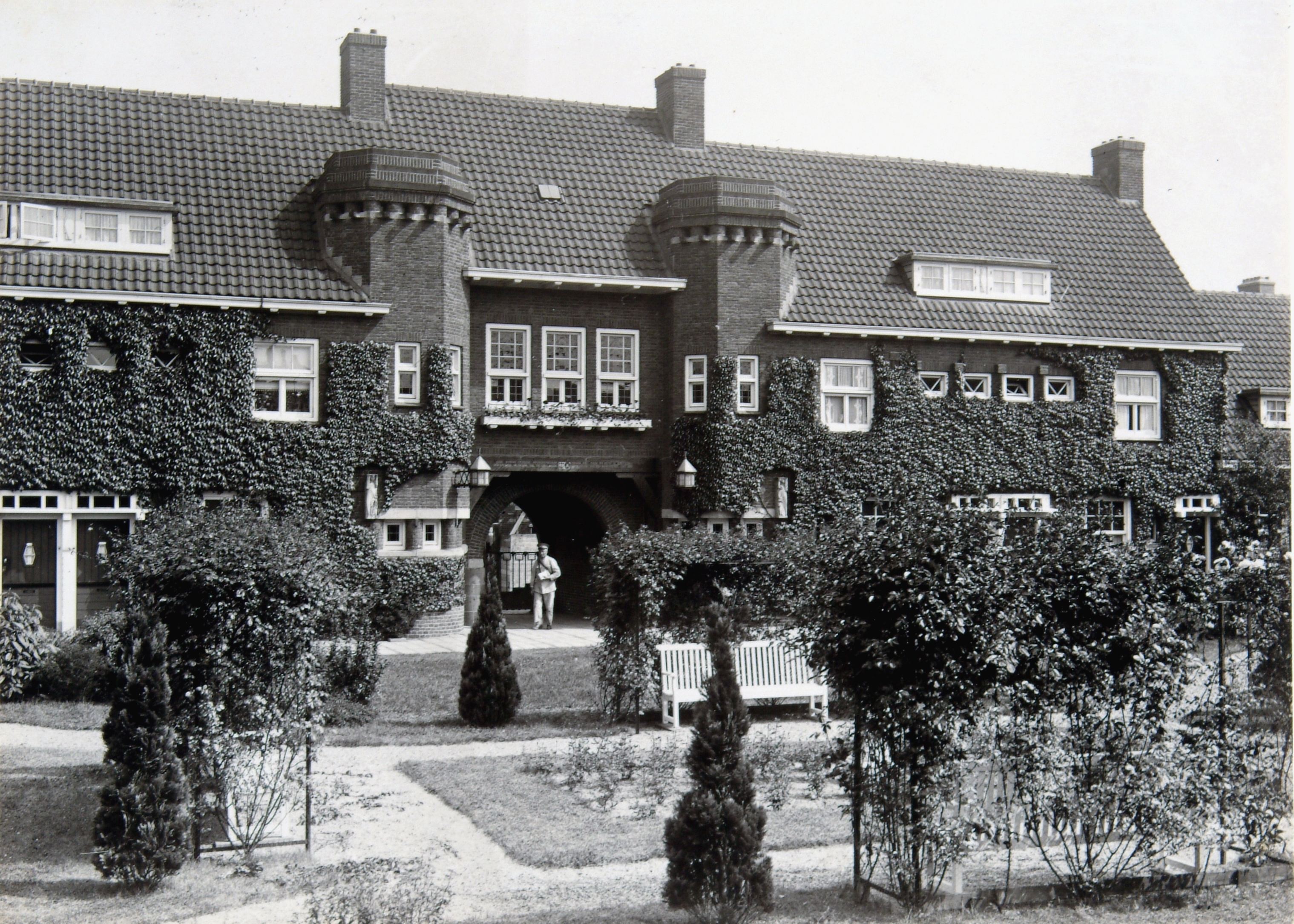 Gezicht op de tuin van de Wilhelminastichting met postbode (?)