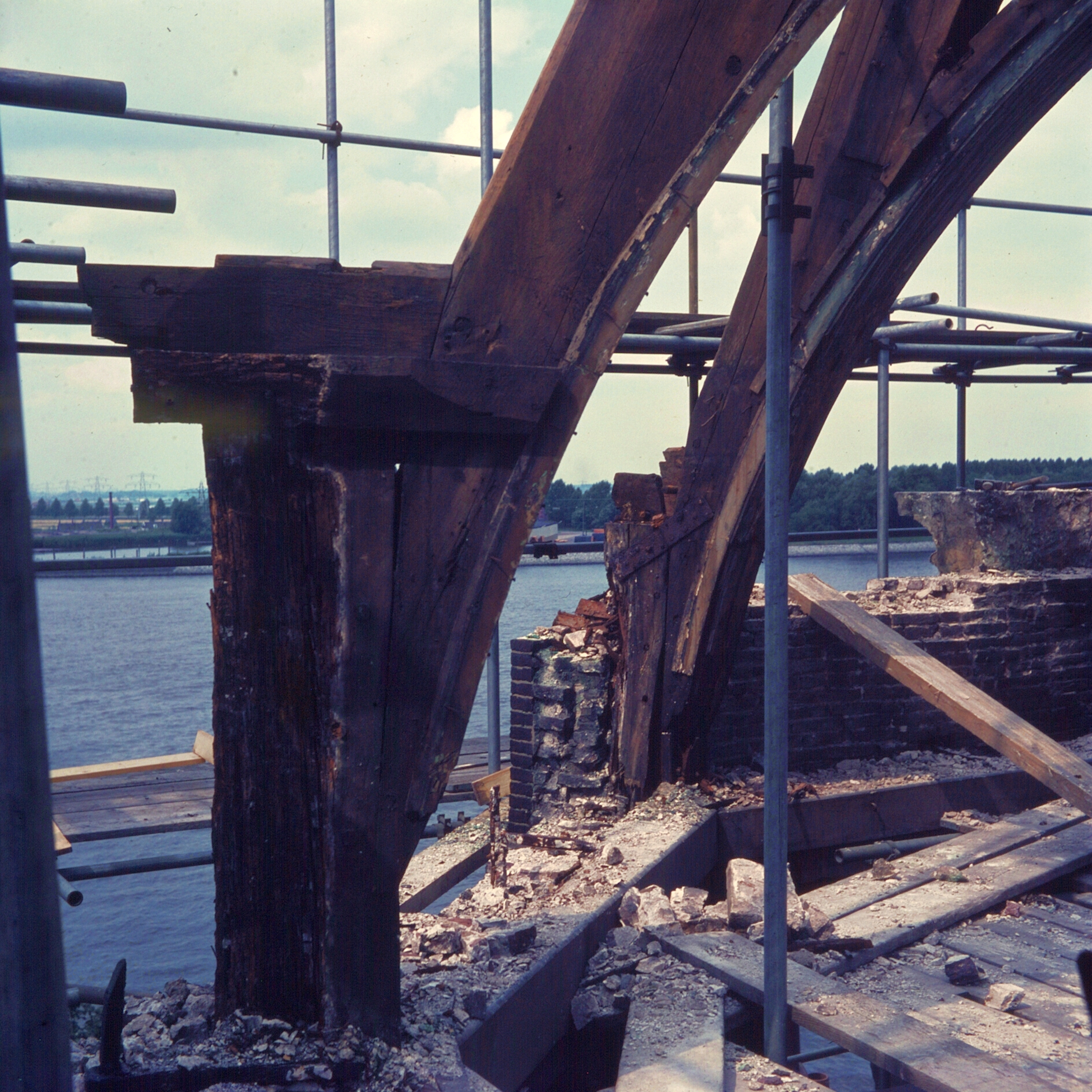 - De werkzaamheden aan de koepel van de Groothoofdspoort, met een mooi doorkijkje naar de rivier.