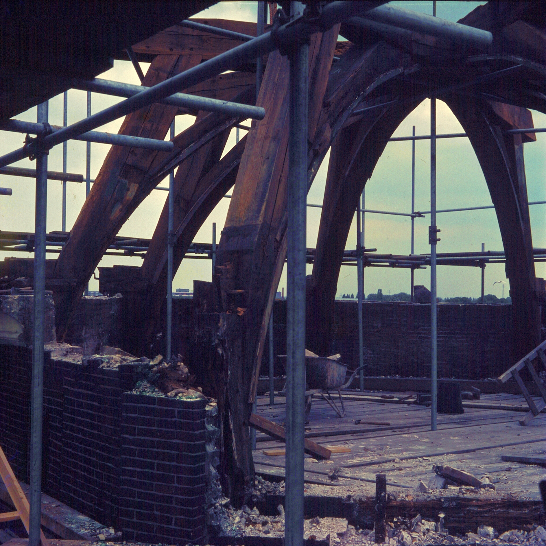 - De werkzaamheden aan de koepel gedurende de renovatie van de Groothoofdspoort.