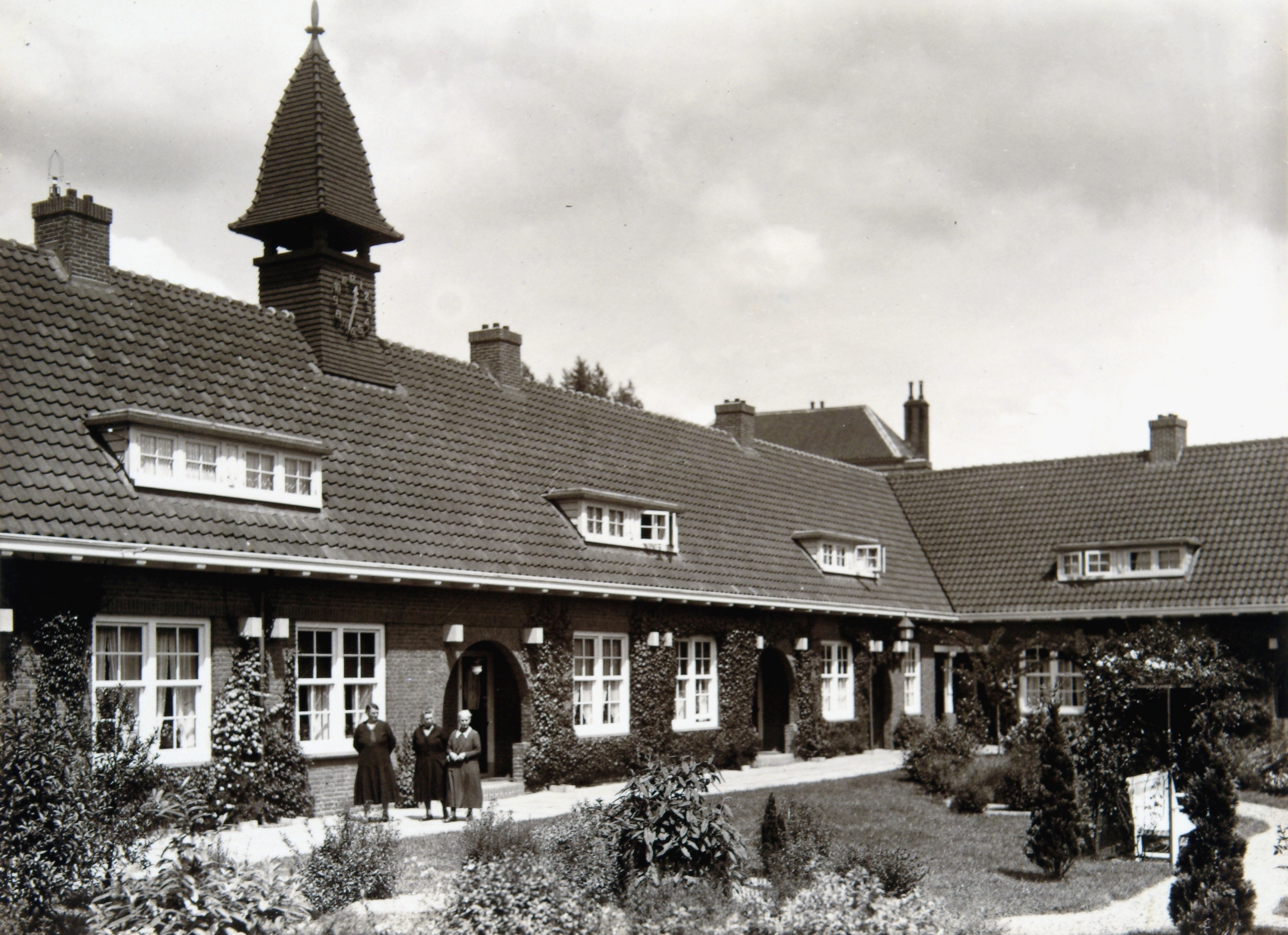 Gezicht in de tuin van de Wilhelminastichting met enkele bewoners