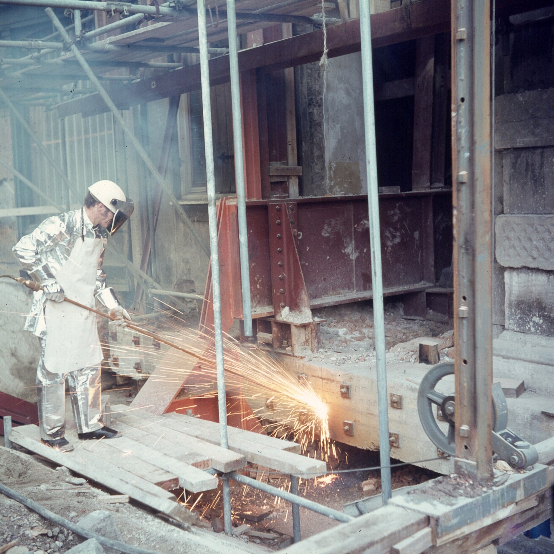 Het gebruik van de thermische lans bij de werkzaamheden aan de Groothoofdspoort.