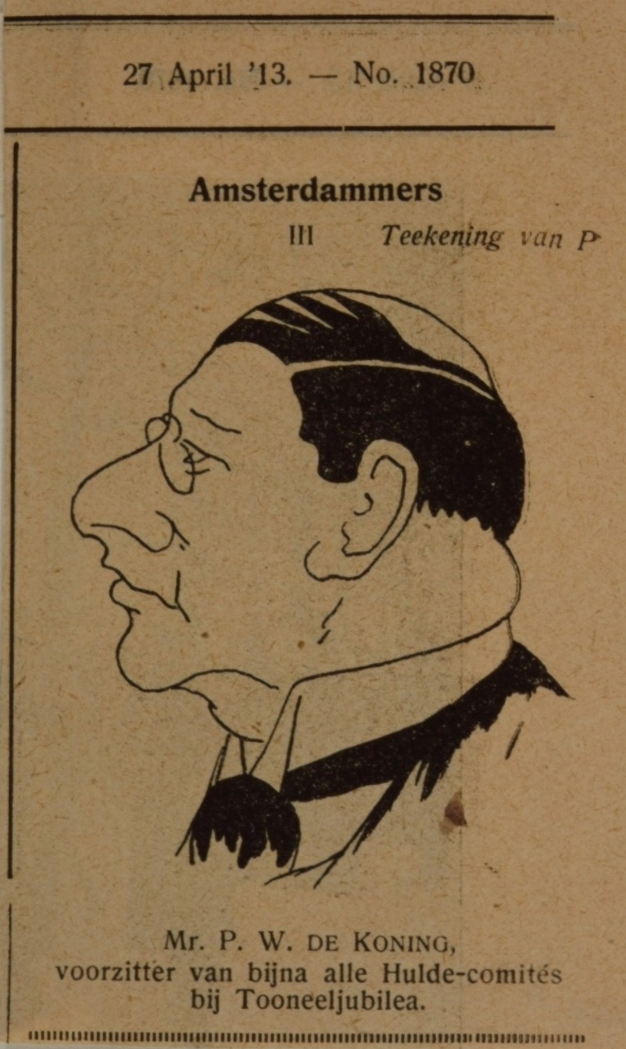 - Uit: De Amsterdammer, weekblad voor Nederland, 27 april 1913 nr. 1370. Naar een tekening van P. Geboren in Dordrecht 1867 en overleden in 1931. Advocaat te Amsterdam, groot bewonderaar en voorstander van het toneel, schrijver en vertaler van onder meer Vergilius.