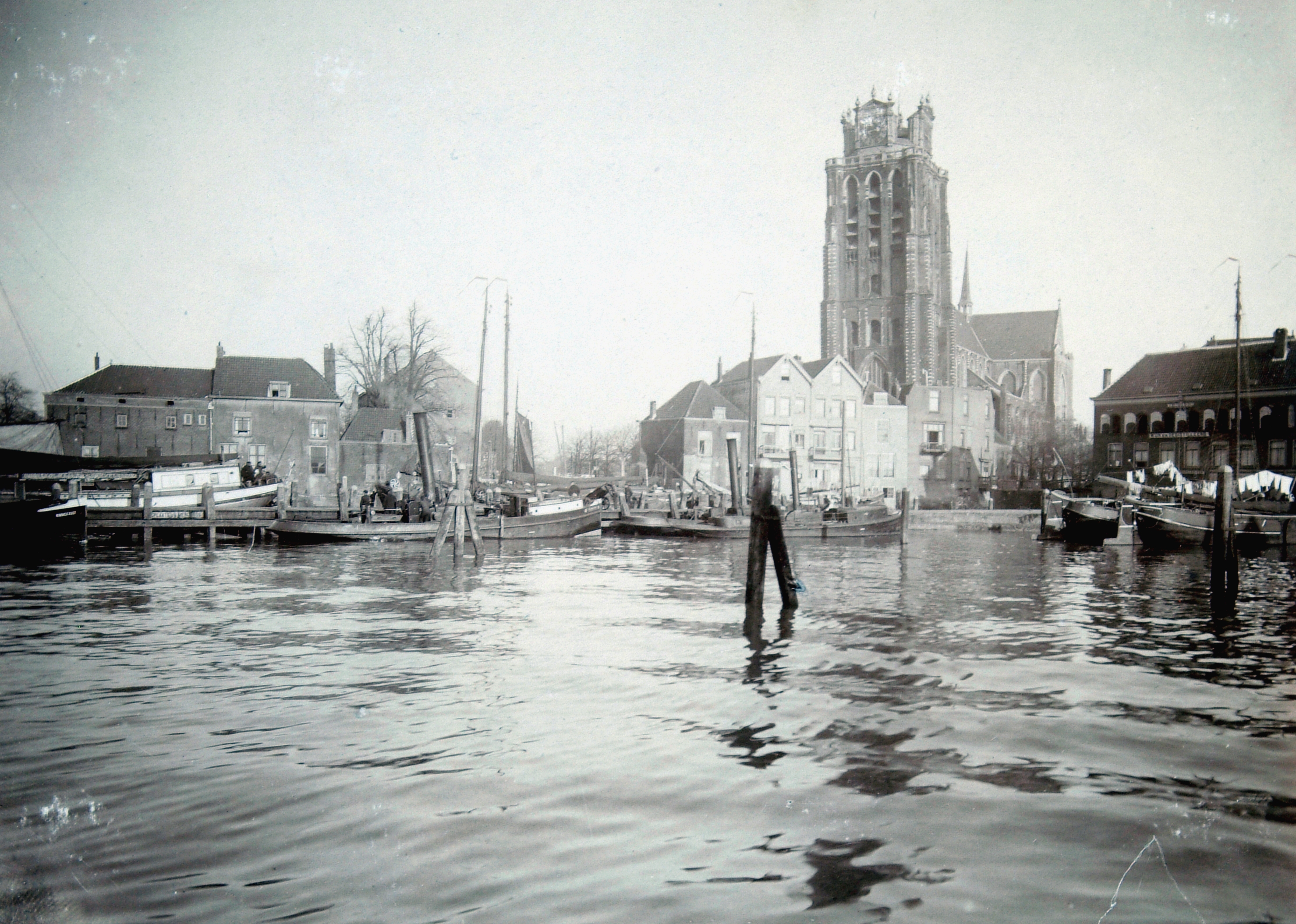 Gezicht op de Bomhaven met schepen langs de pier en de kade. rechts het pand van de familie Dicke. Links de achtergevels van huizen aan de Mazelaarsstraat, in het midden de achtergevels van huizen aan de Korte Geldersekade.