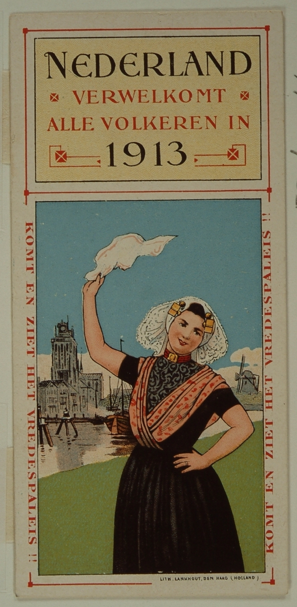 - Reclamekaart van de Commissie voor Plan 1913 ter gelegenheid van de opening van het Vredespaleis in Den Haag. Op de achtergrond de Grote Kerk van Dordrecht