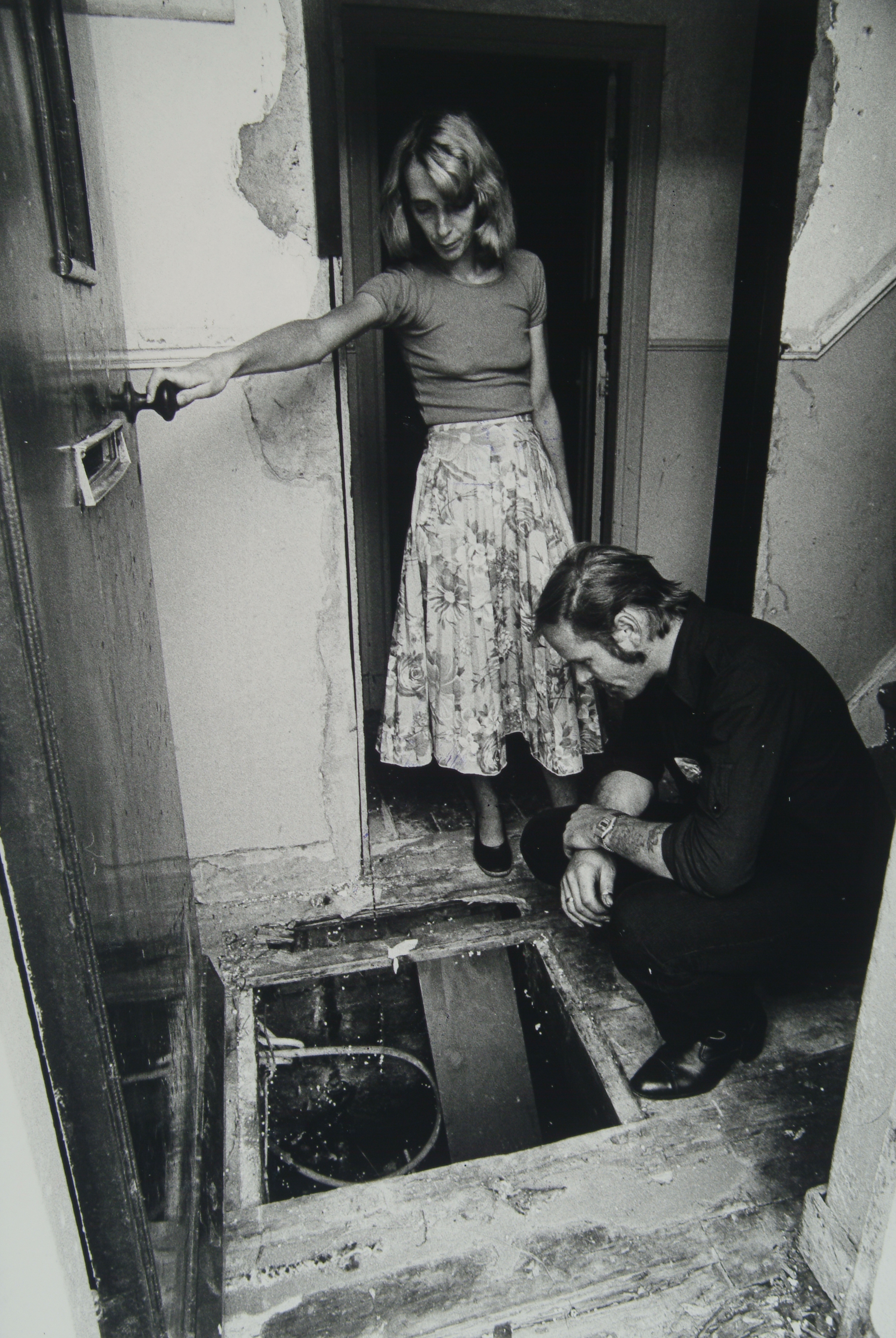 - Bewoners bekijken de toegang tot de kruipruimte achter de voordeur van een zeer vervallen pand in de J.J.A. Goeverneurstraat