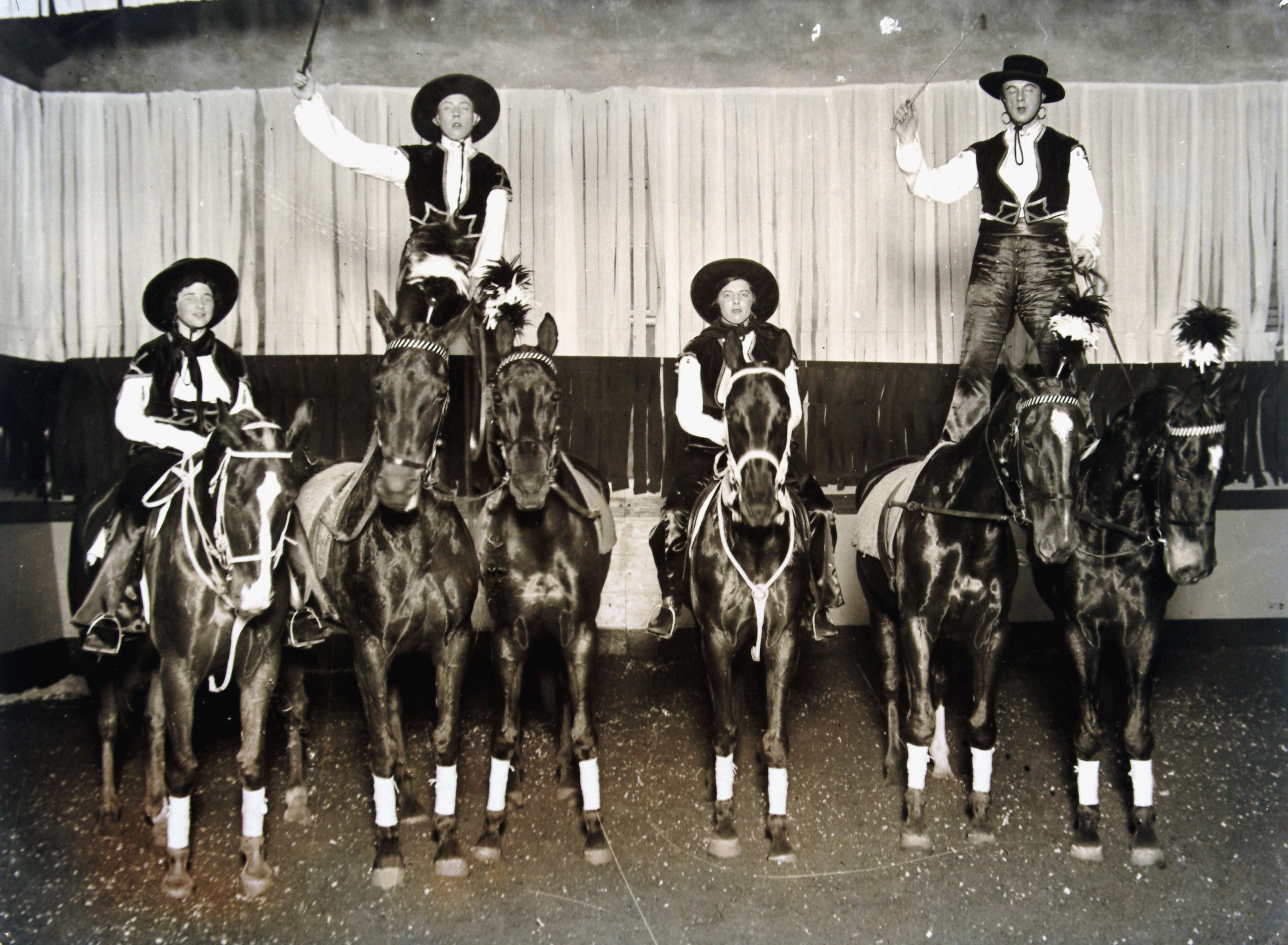 Rijfeest in de manege. V.l.n.r.: mej. L. van Oven, P. van Aardenne, mej. Van Aardenne …