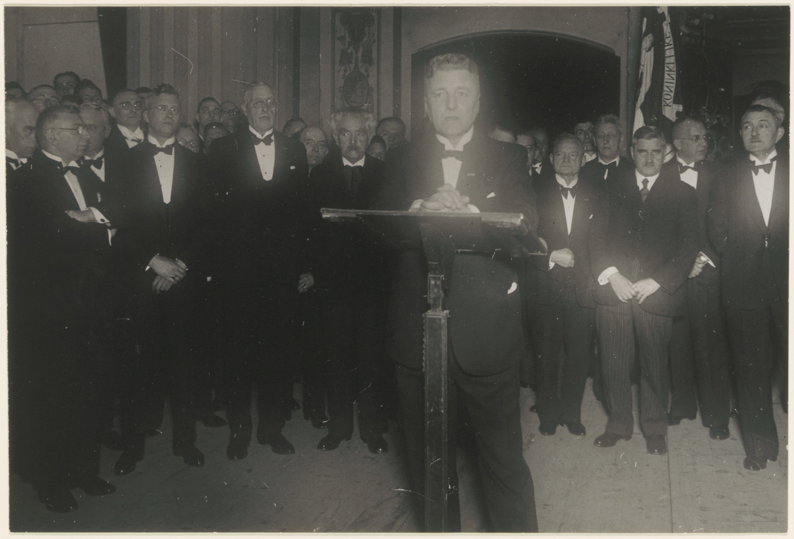 Burgemeester J. Bleeker spreekt tijdens het veertigjarig bestaan van de muziekvereniging Kunst na Arbeid.