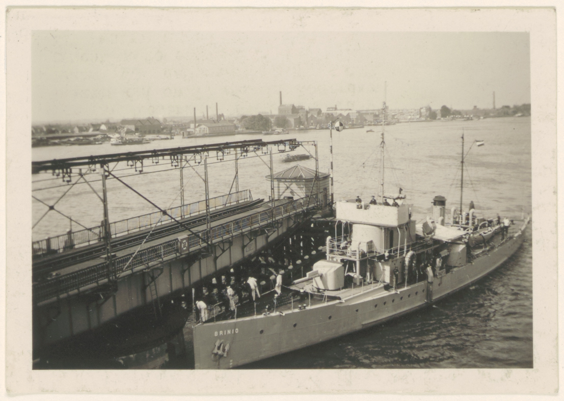 - Het oorlogsschip H.M.Brinio onder commando van de Lt. ter zee H. Bax passeert de geopende spoorbrug over de Oude Maas voor een bezoek aan Dordrecht.