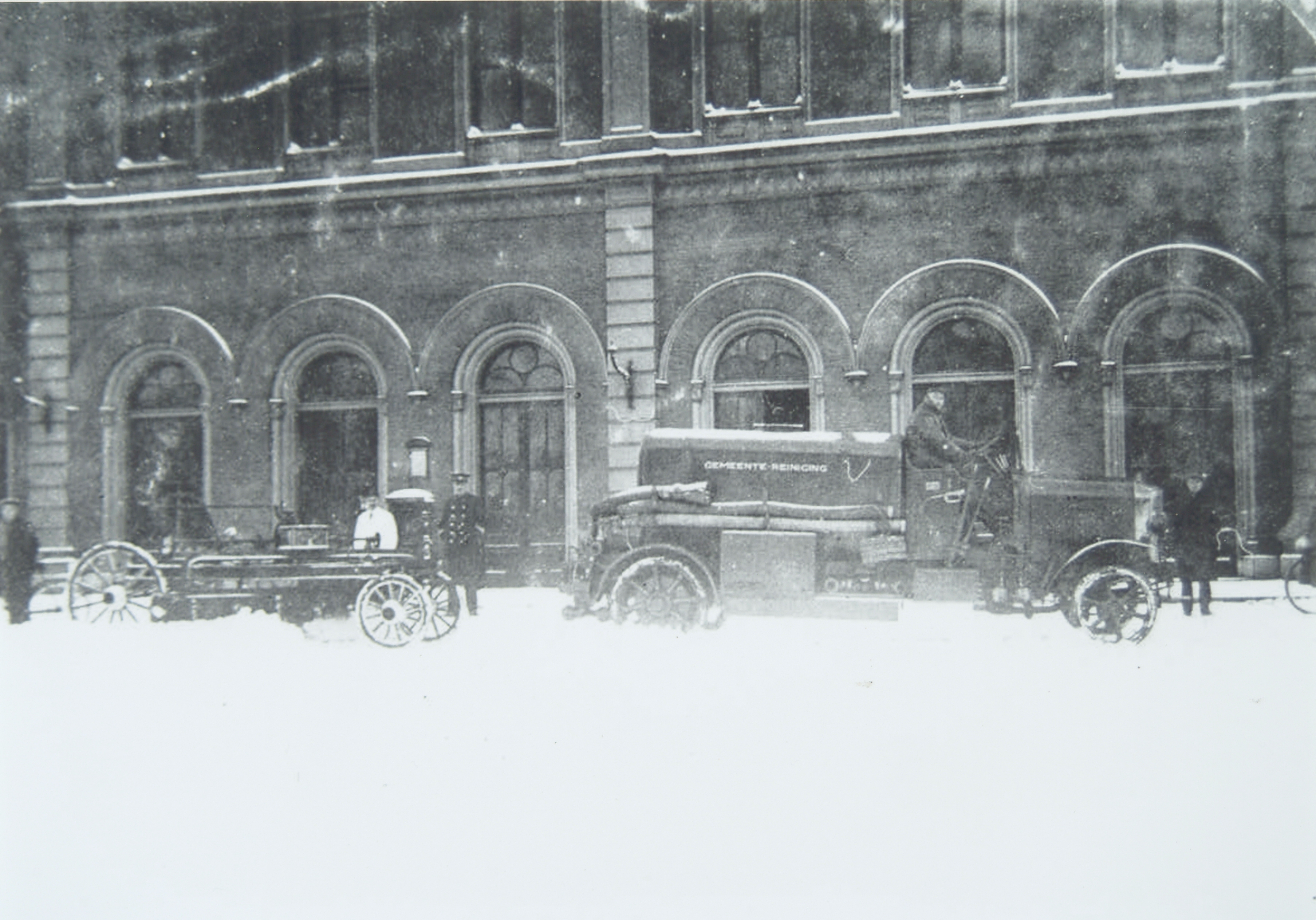 - Sproeiwagen van de gemeentereiniging voor het station in de sneeuw