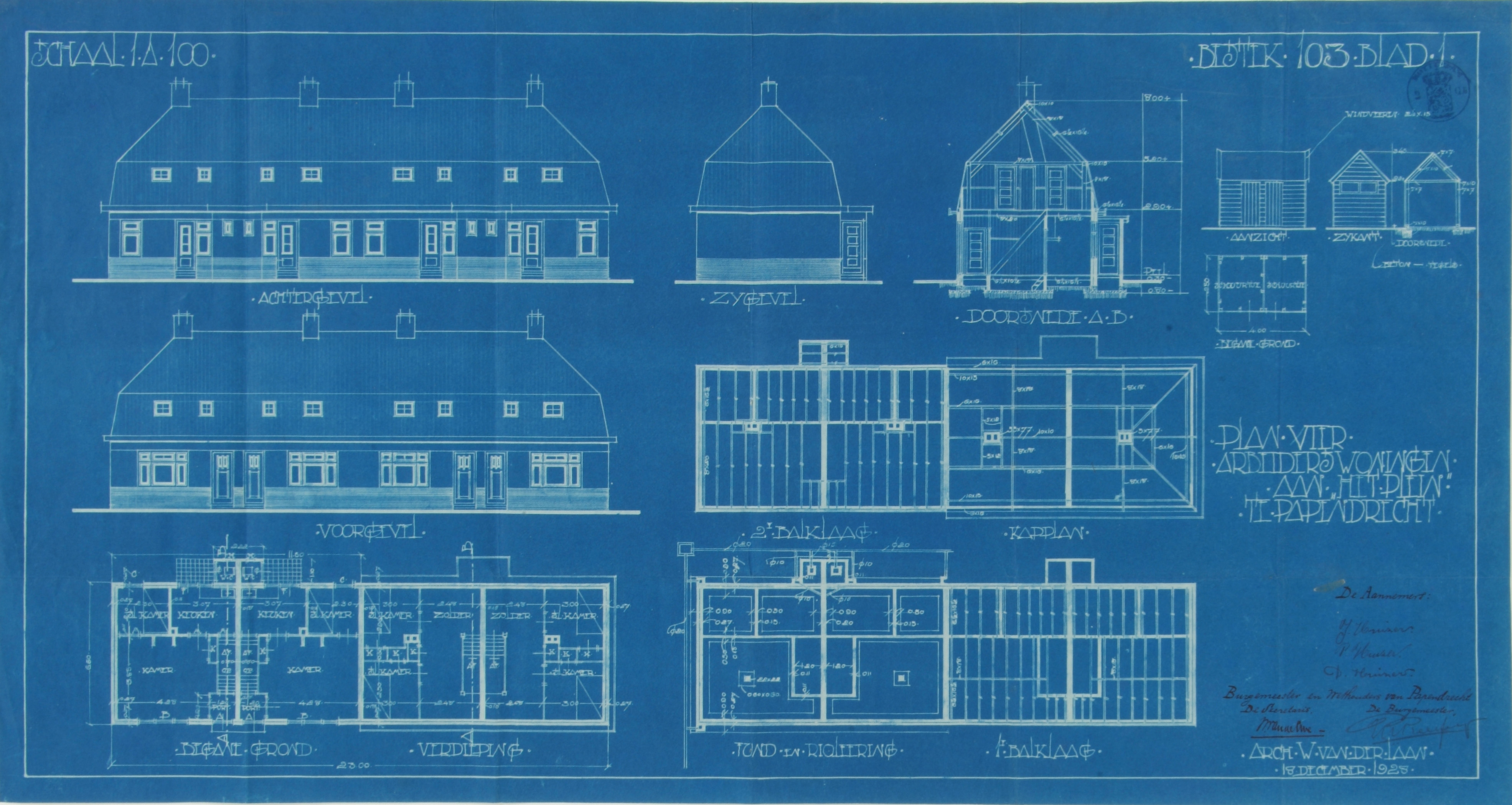 - Bouwtekening van 4 arbeiderswoningen aan Het Plein te Papendrecht.