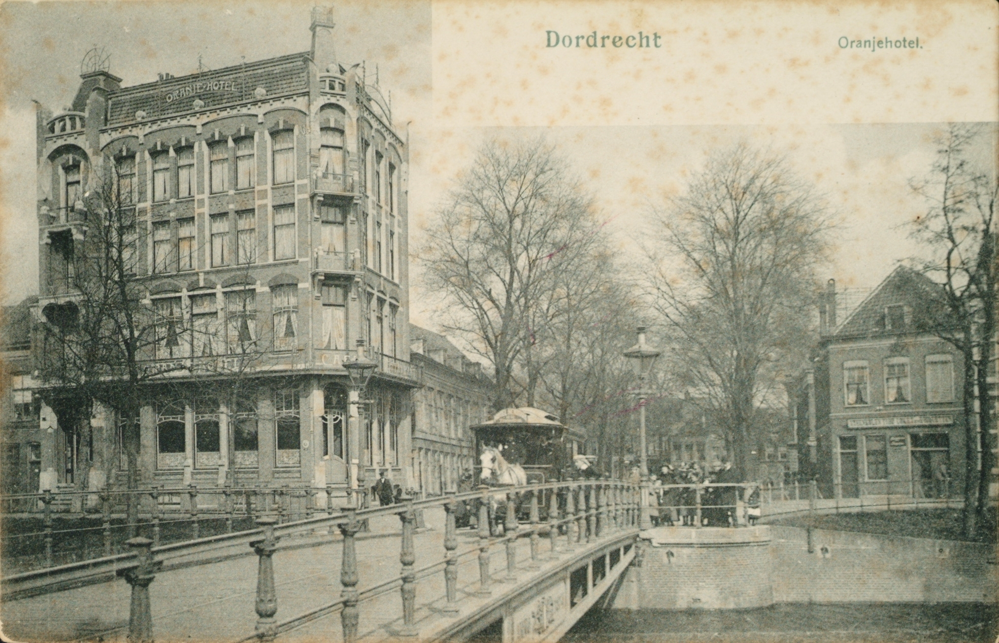 - Links het Oranjehotel, rechts op de Vest een steenkolenhandel.