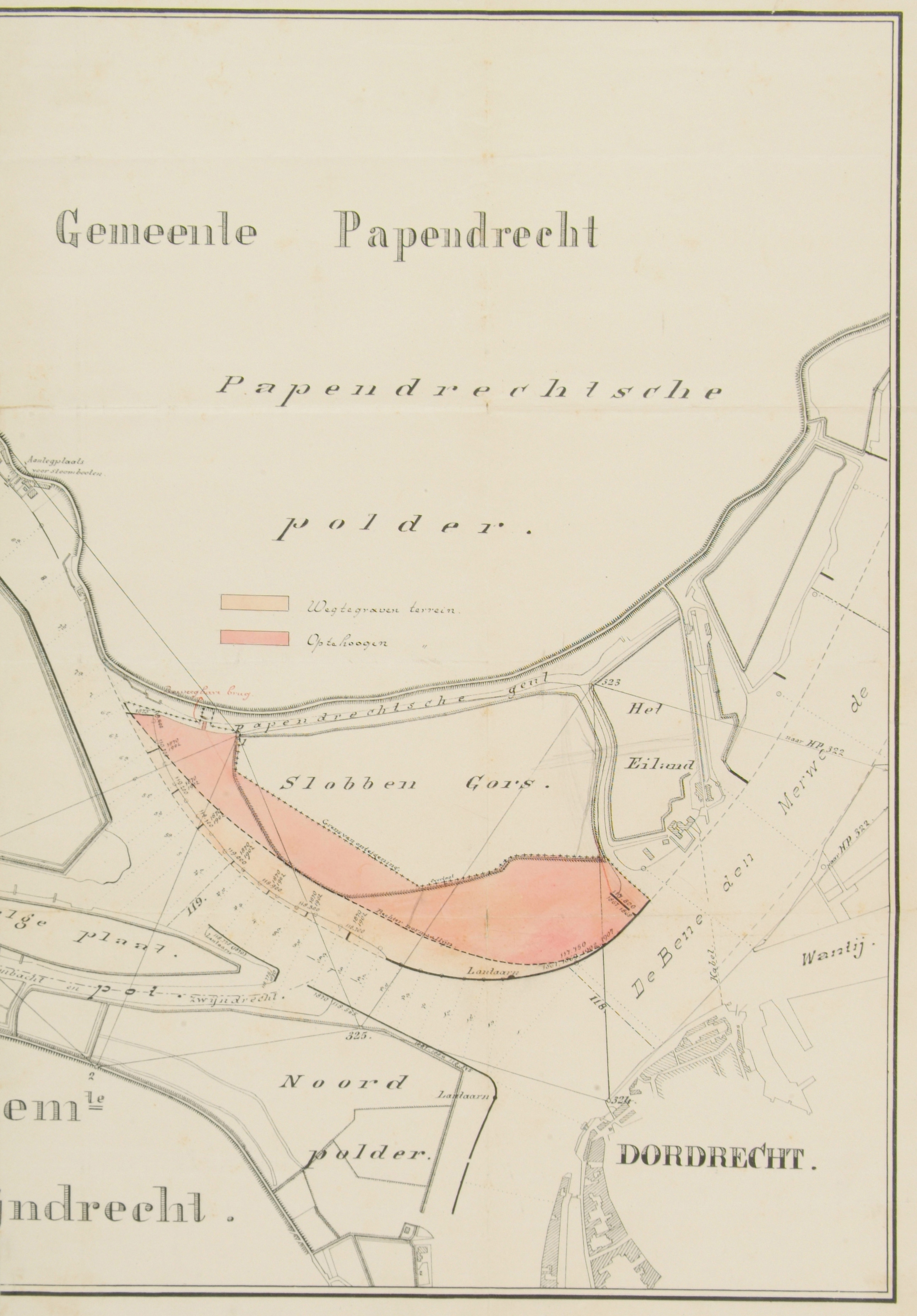 - Plattegrond van het Slobbegors te Papendrecht met aanduiding van weg te graven en op te hogen terrein.