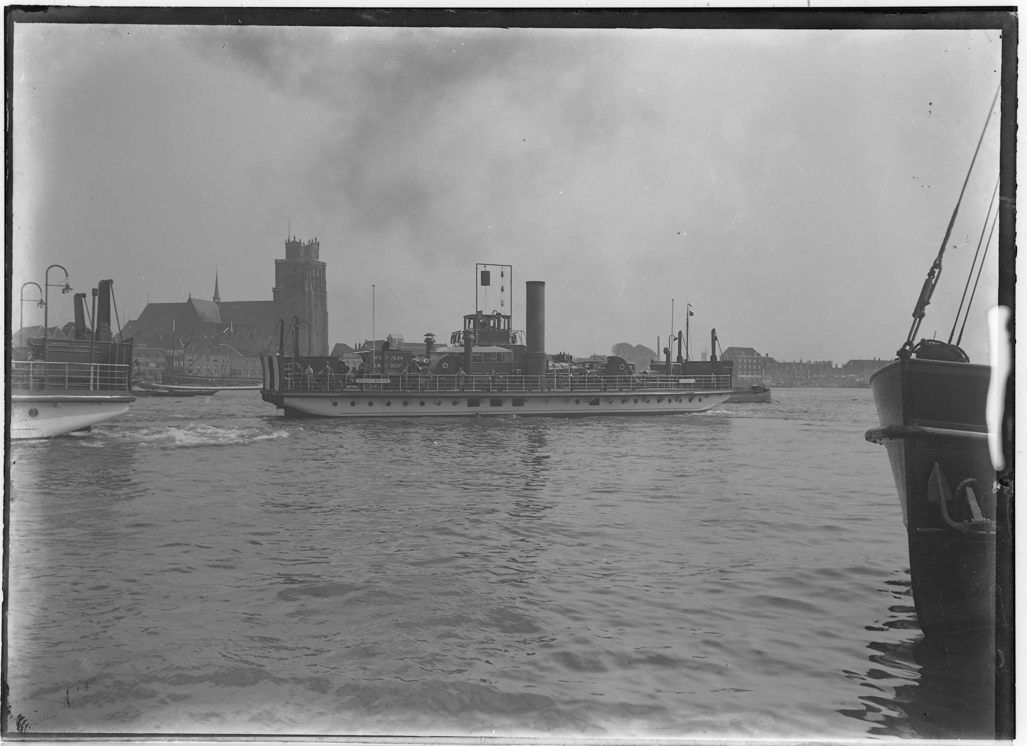 Veerdienst Dordrecht Zwijndrecht op de Oude Maas met de Grote Kerk op de achtergrond