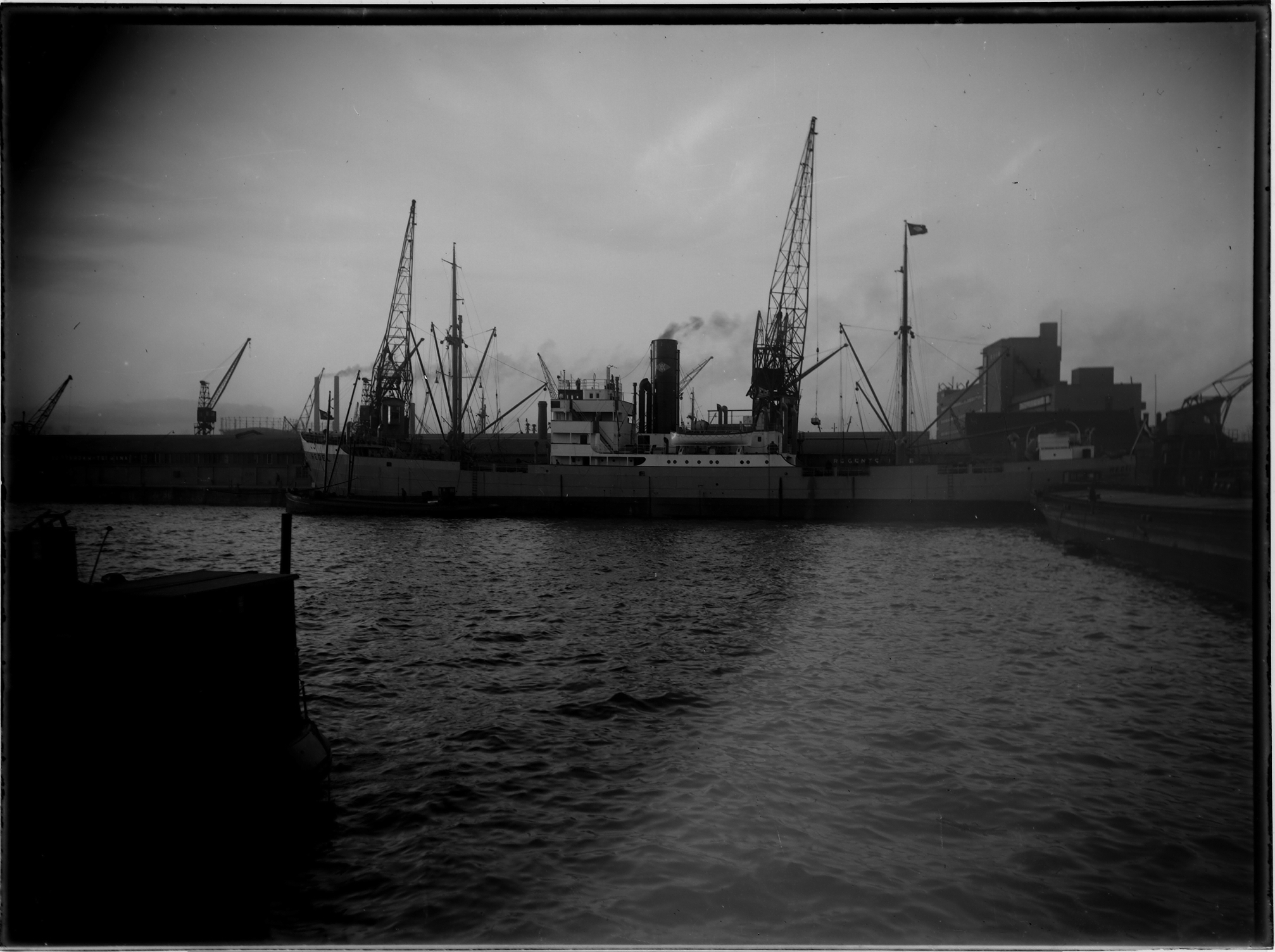 De IJsselhaven in Rotterdam. Op de achtergrond het, nog steeds bestaande, HAKA gebouw aan de Lekhaven/Vierhavenstraat.
