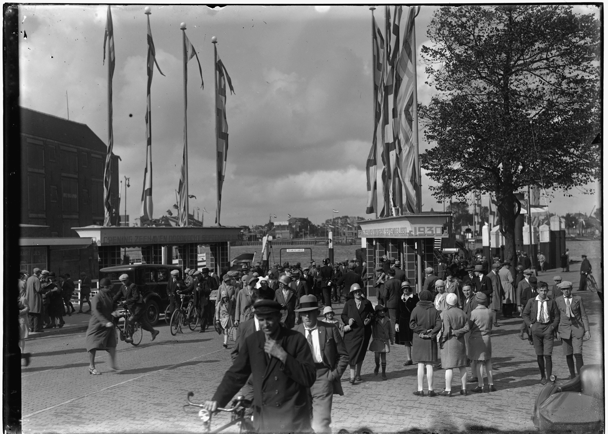 - Drukte op het Blauwpoortsplein bij het Zwijndrechts veer tijdens de opening van de Zeehaven.