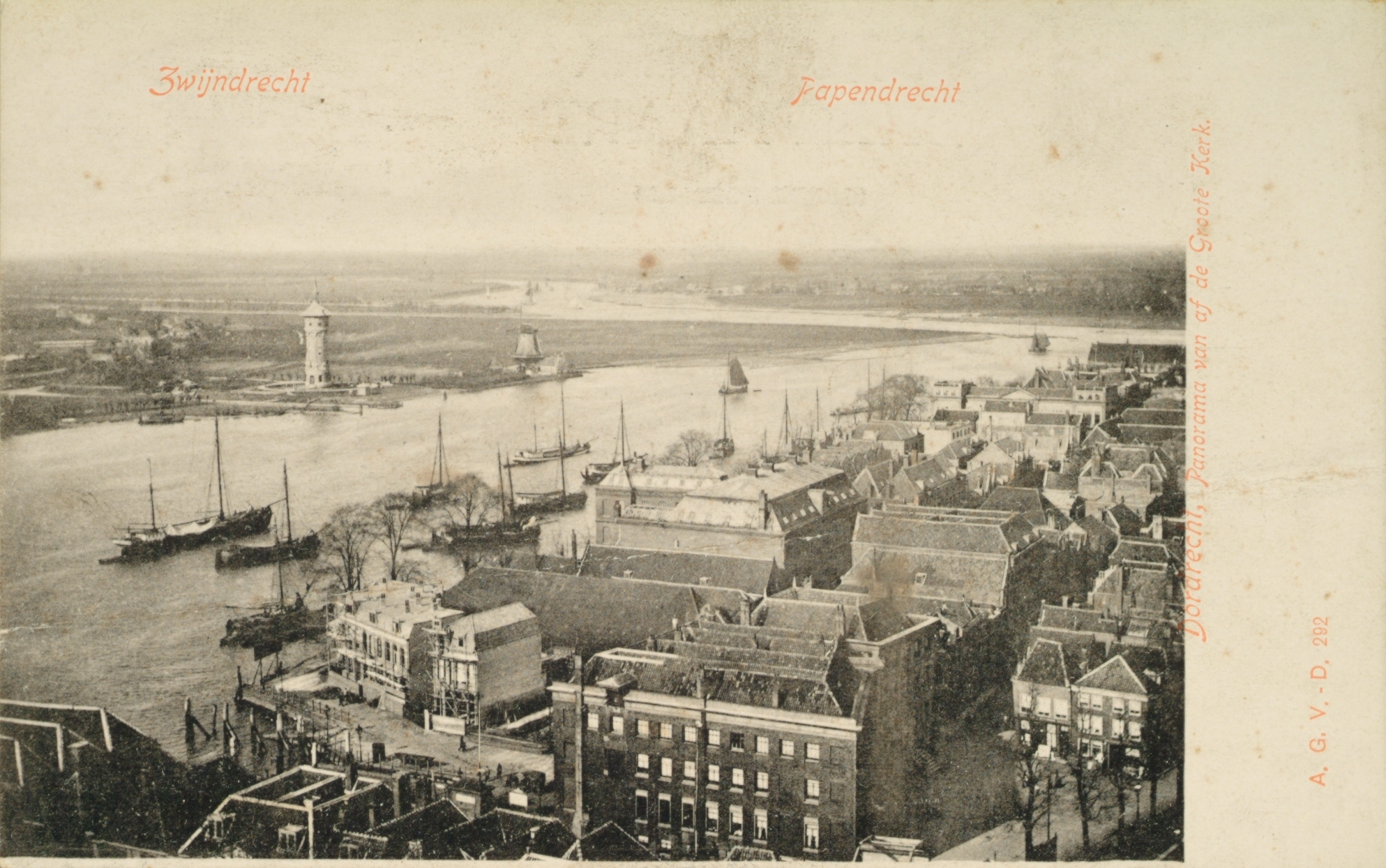 - Op de voorgrond de Blauwpoort en de Buiten Walevest. Aan Zwijndrechtse zijde de Watertoren en Molen Welgelegen. Voor alle zekerheid is aan de bovenzijde omschreven waar Papendrecht en Zwijndrecht liggen.