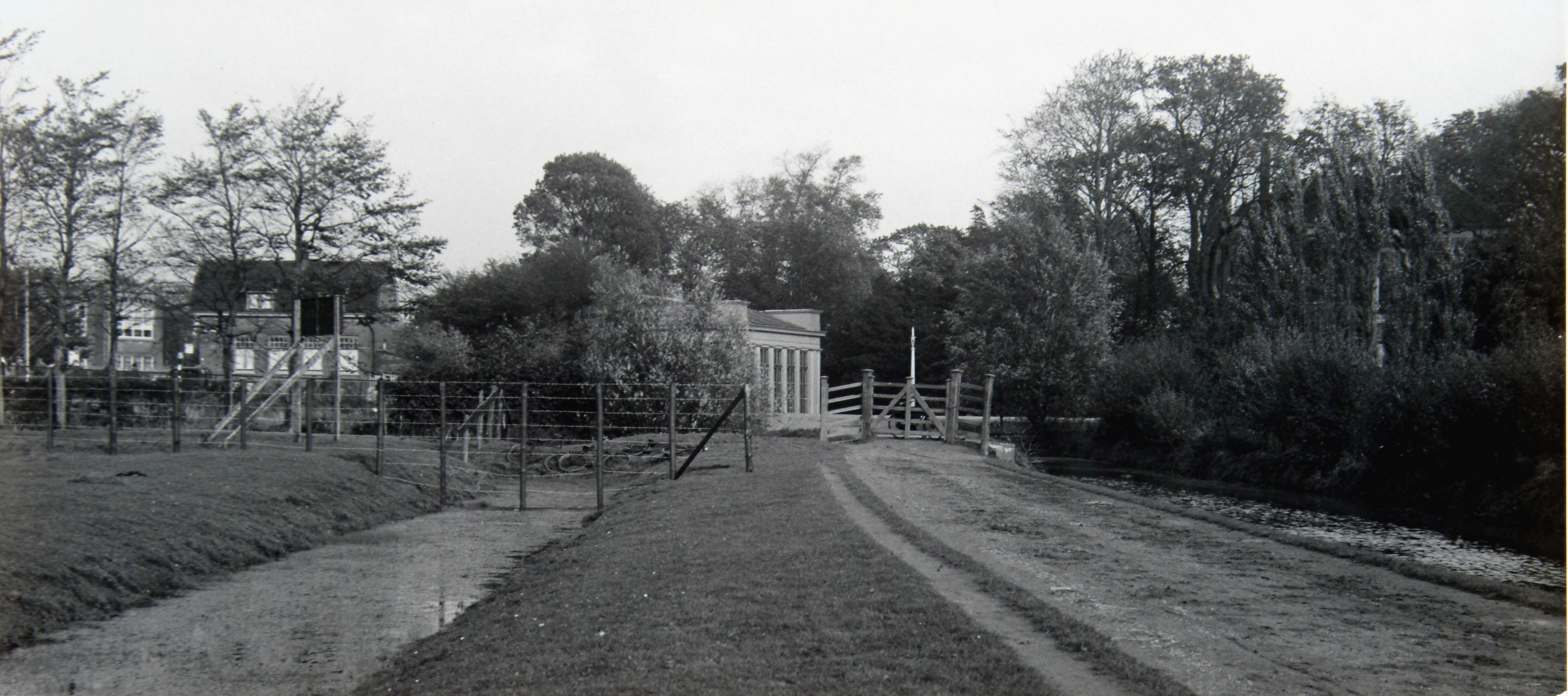 - Het pad in de weide van De Roo richting Krispijnseweg. Rechts achter de bomen villa Weizigt. Links de Burgemeester de Raadtsingel met de Lipsfabriek, het treinwachtershuis, deel van de Vuile Vliet en de Orangerie van de villa van Fam. De Roo van Westmaas.