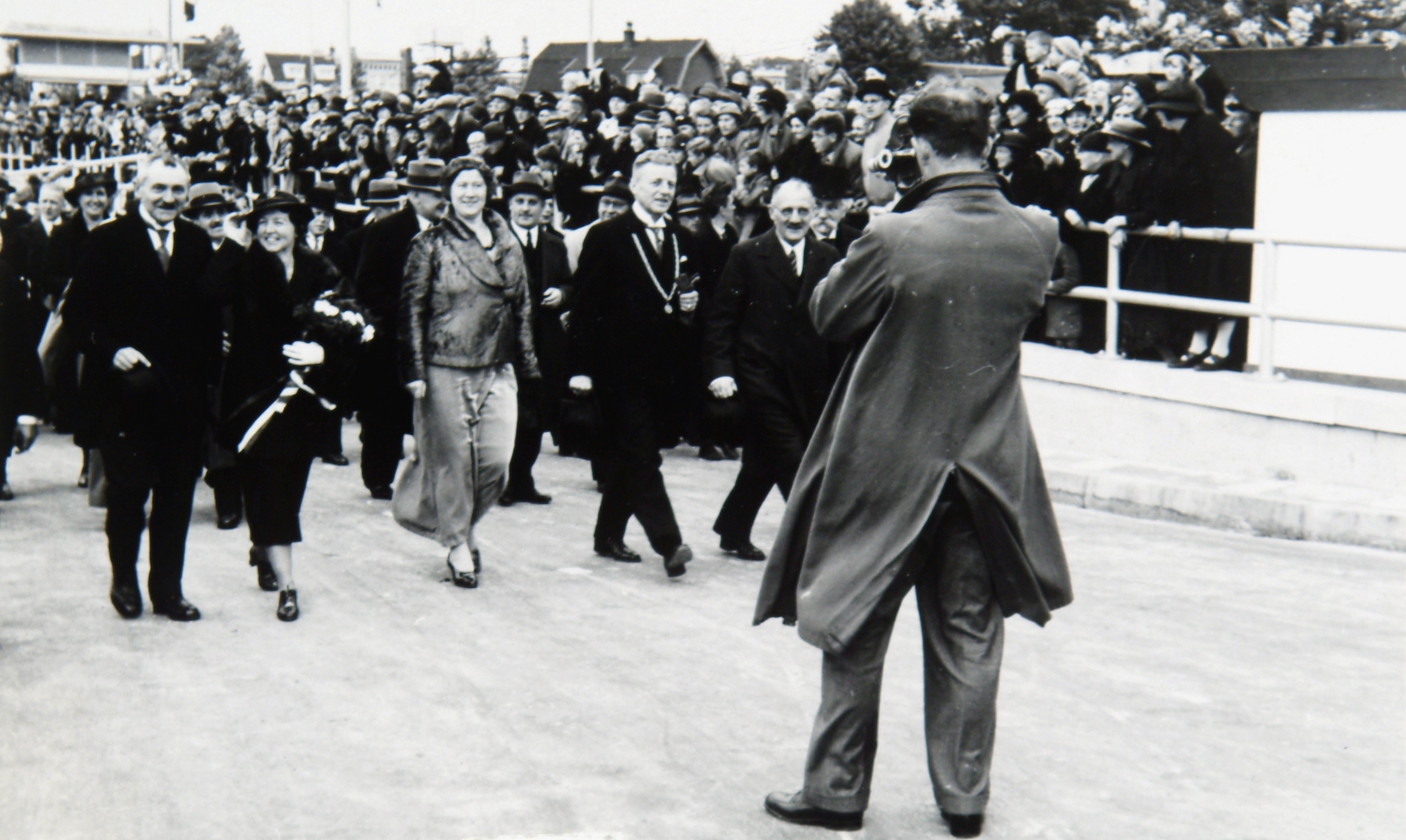 - Autoriteiten lopen door de zojuist geopende Krispijntunnel in de richting van Krispijn. O.a. burgemeester Bleeker en zijn vrouw (met bloemen).