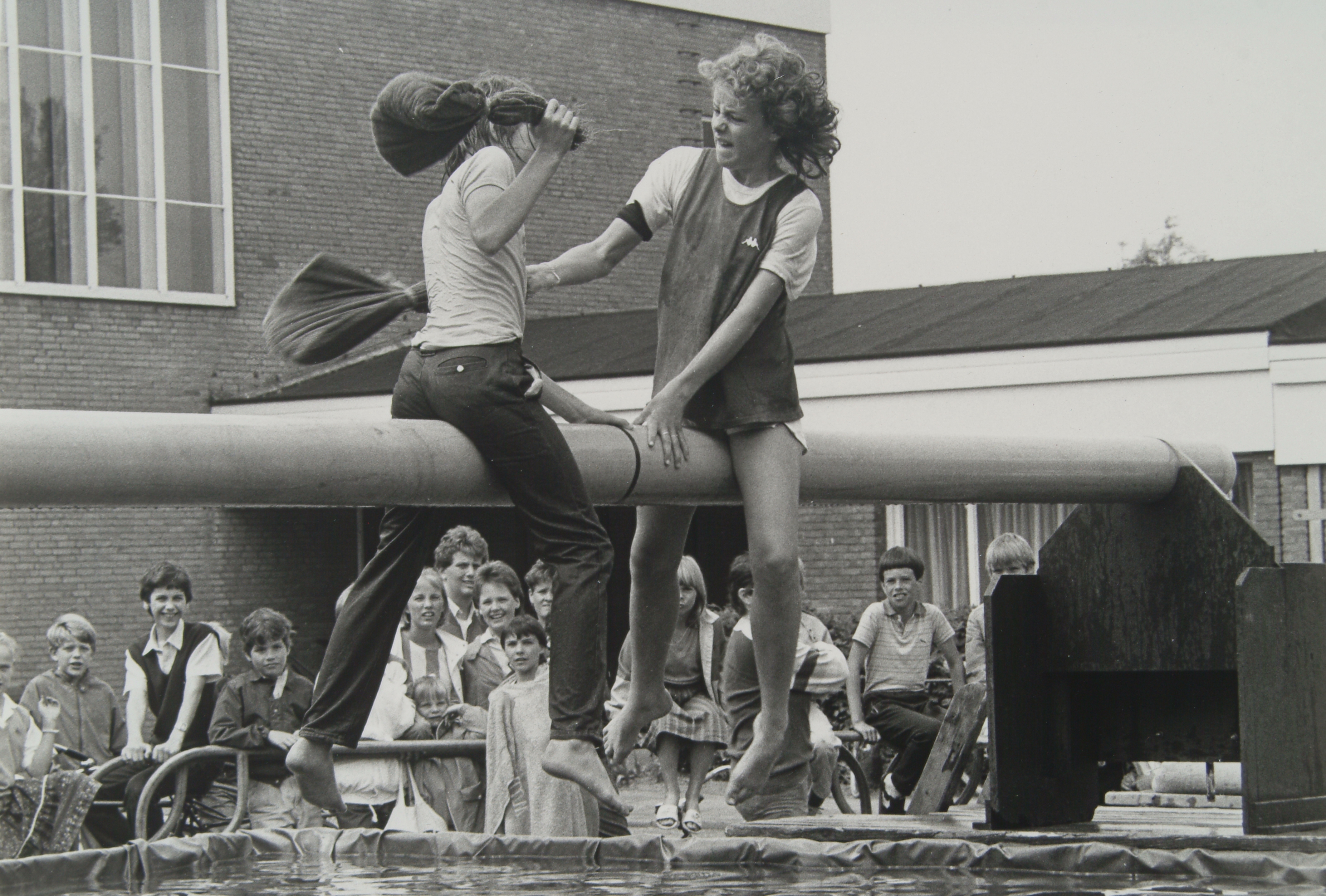 Boegsprietvechten door kinderen tijdens de vakantiekinderfeesten