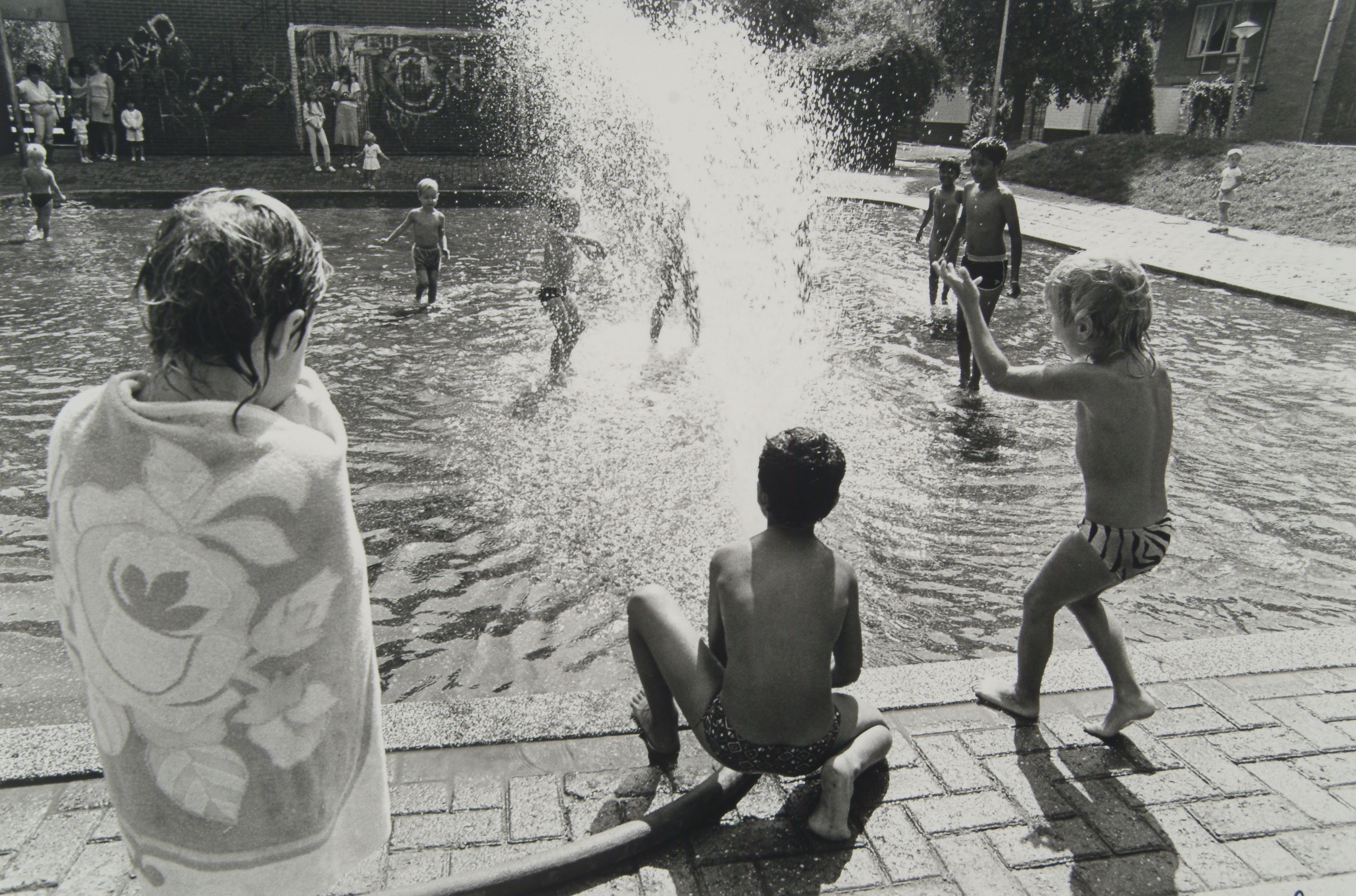 Kinderen spelen in het onder water gezette pleintje achter het Gemeentearchief aan het …