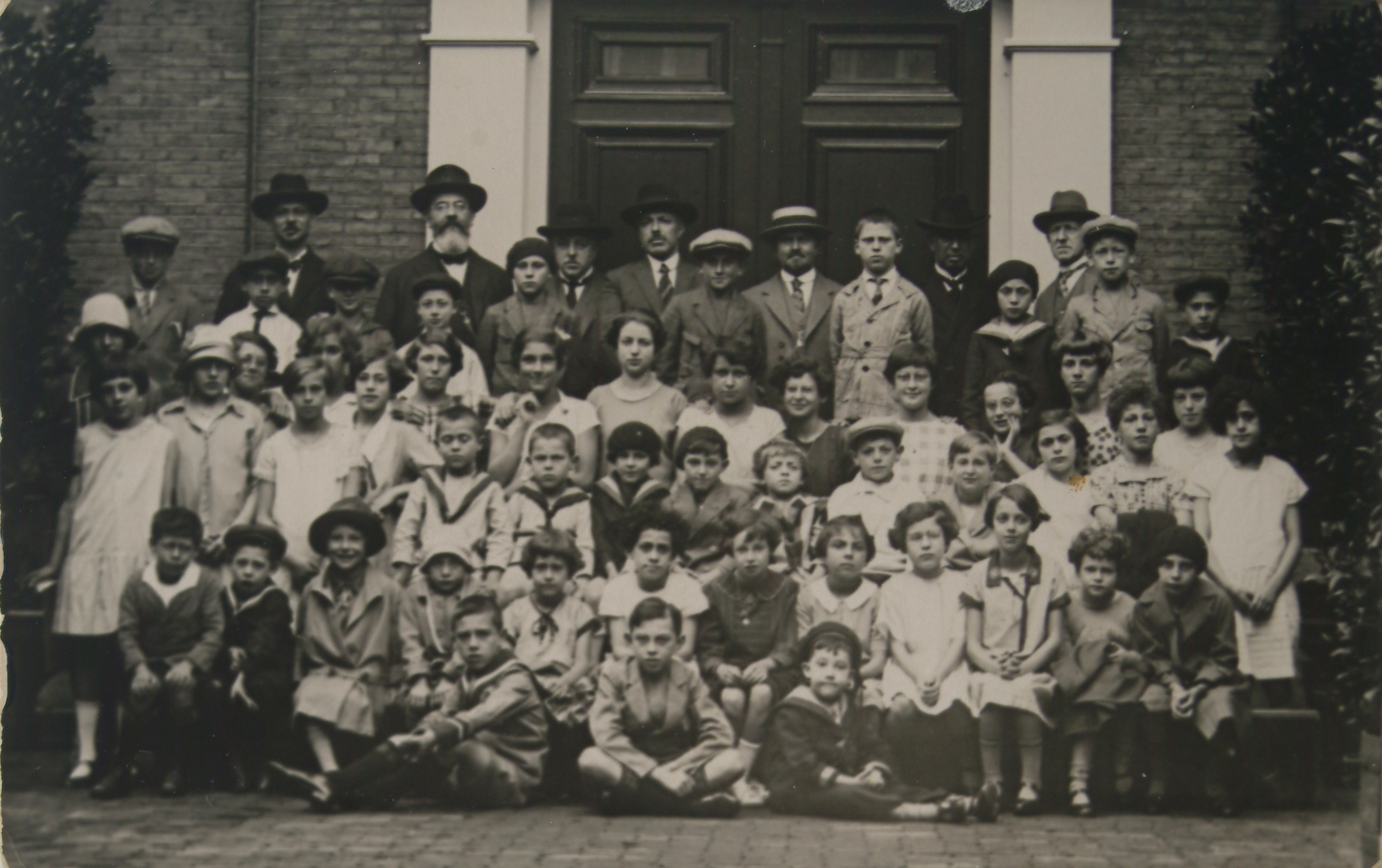 - Groepsportret van Joodse gemeenteleden voor de synagoge aan de Varkenmarkt t.g.v. het 70-jarig bestaan van de synagoge