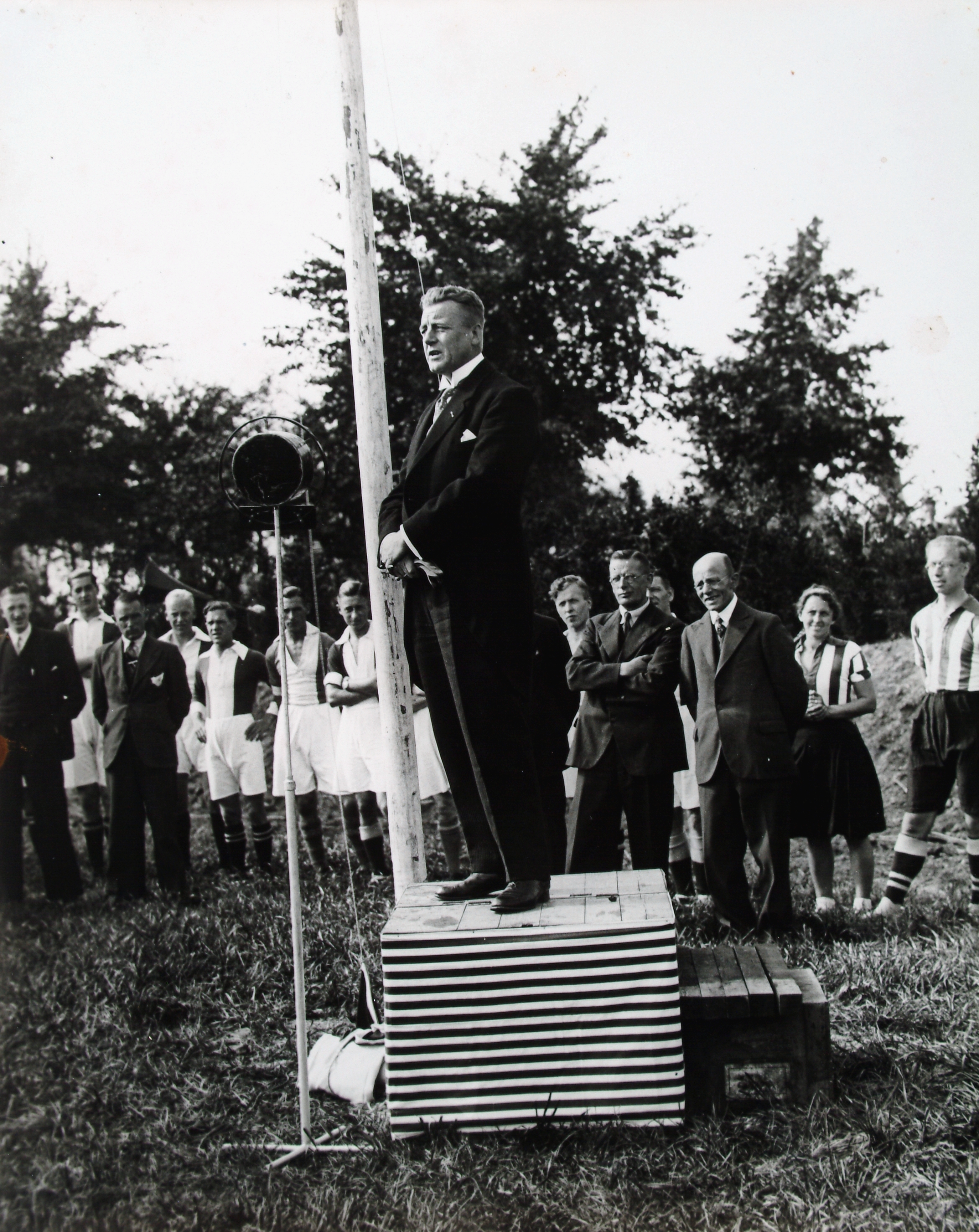 Burgemeester Bleeker bij de opening van de sportterreinen aan de Staart.