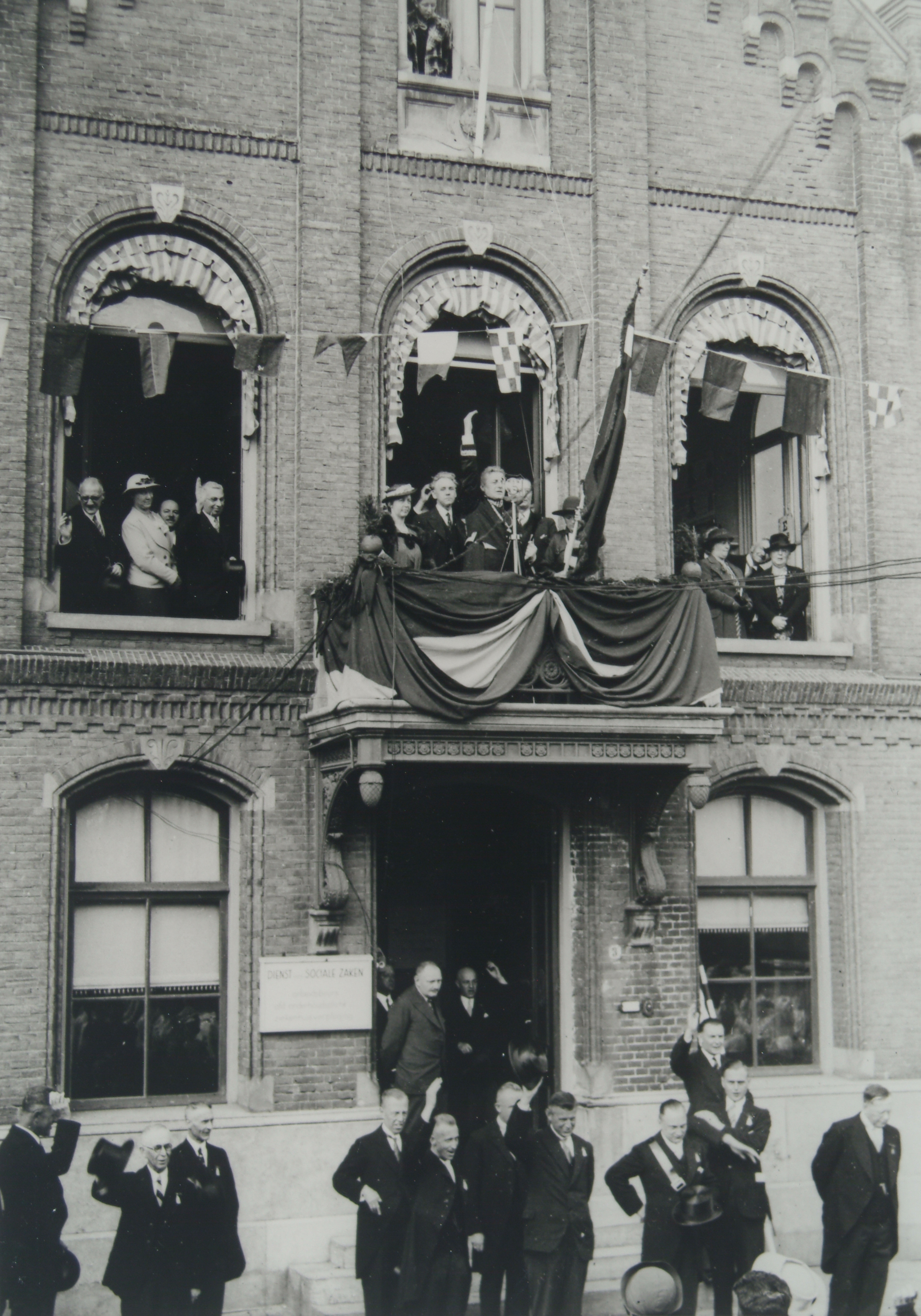 Burgemeester J. Bleeker op het balkon van het gebouw van de Dienst voor Sociale Zaken …