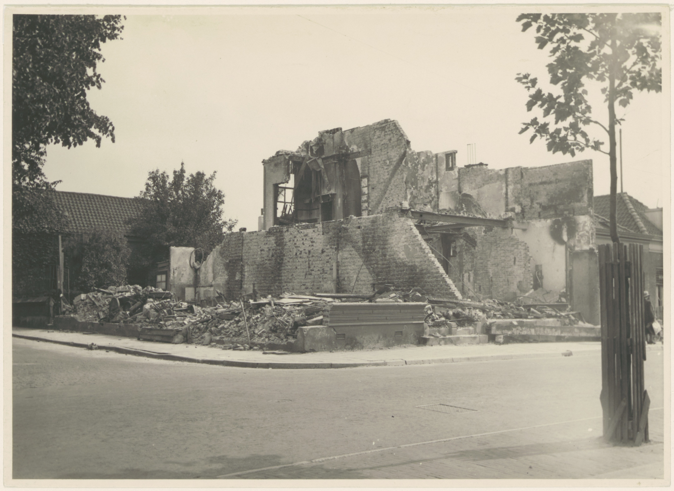 - Vernielde drukkerij en een Coöp-winkel in de Toulonselaan (nummers 70-72) hoek De la Reijstraat (links) door oorlogsgeweld in de meidagen van 1940.