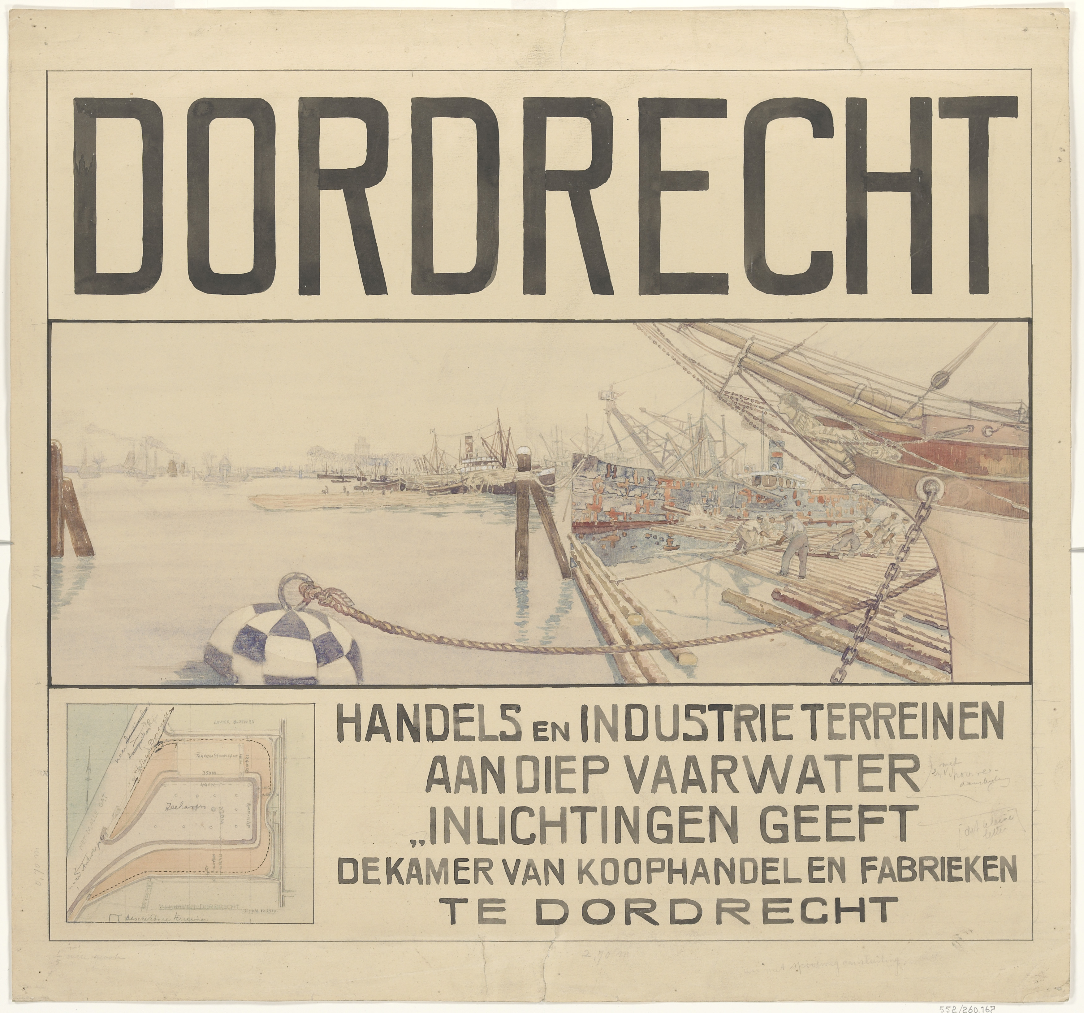 - Het ontwerp voor een affiche voor de handels- en industrieterreinen aan het Mallegat, met tekening en plattegrond van de Wilhelminahaven.