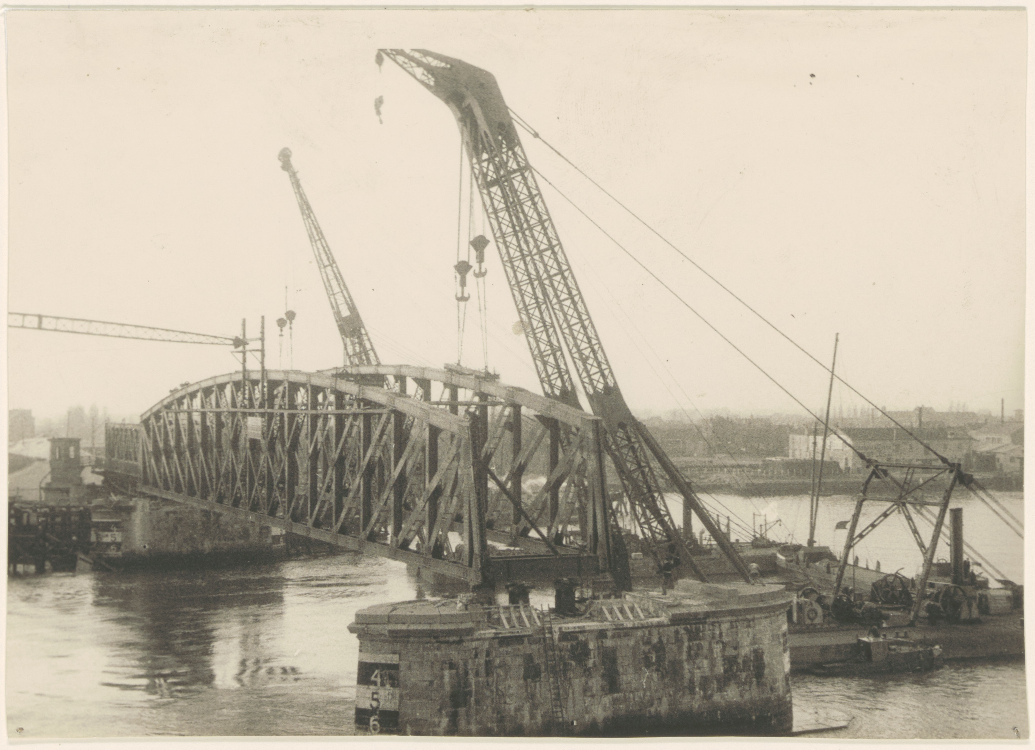 - Het plaatsen van een van de nood-overspanningen tijdens het voorlopig herstel van de spoorbrug over de Oude Maas. De brug was door de Duitsers opgeblazen in de Tweede Wereldoorlog.