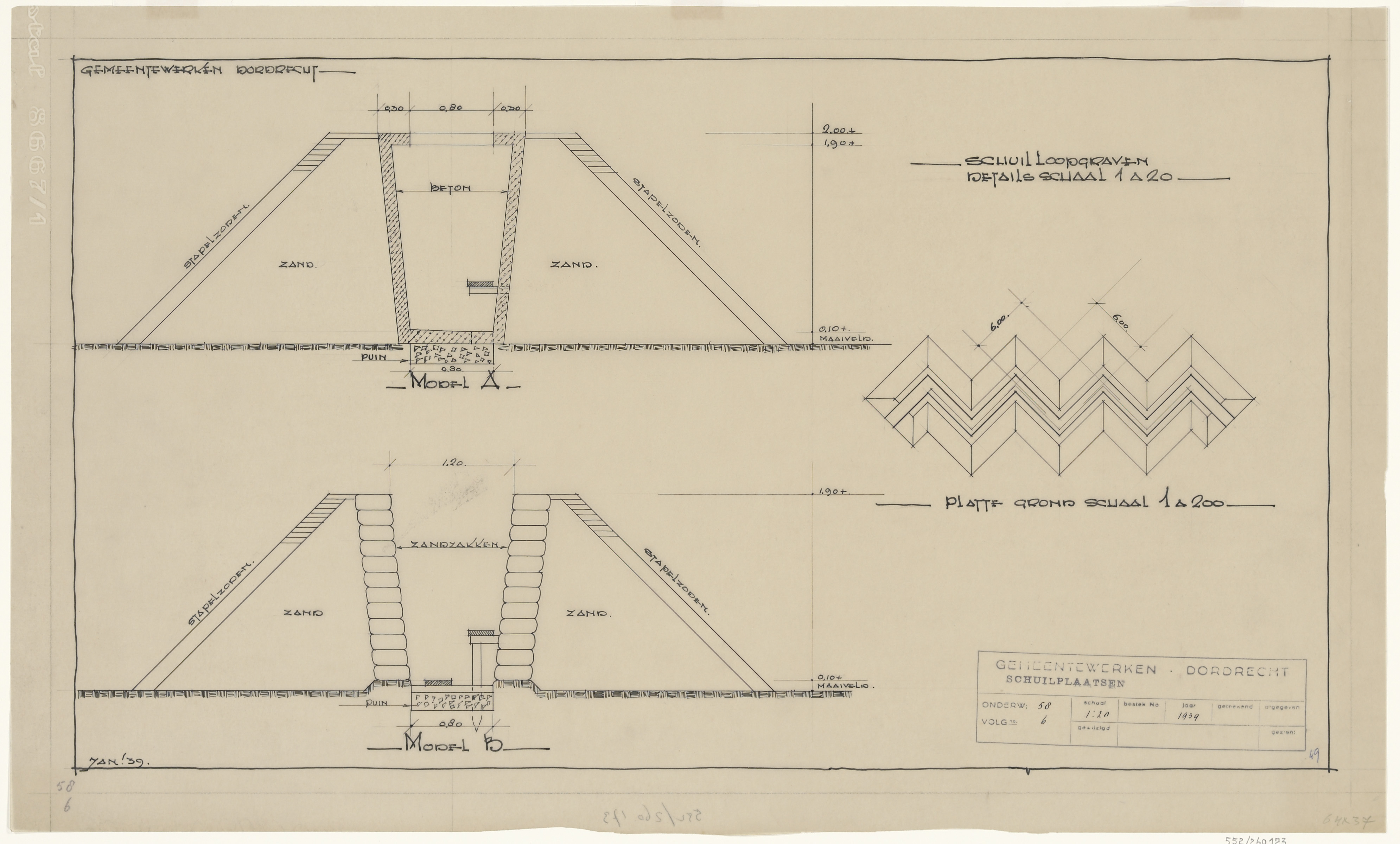 - 2 ontwerpen van schuilloopgraven voor de luchtbescherming. Gegeven zijn doorsneden van model A en model B.