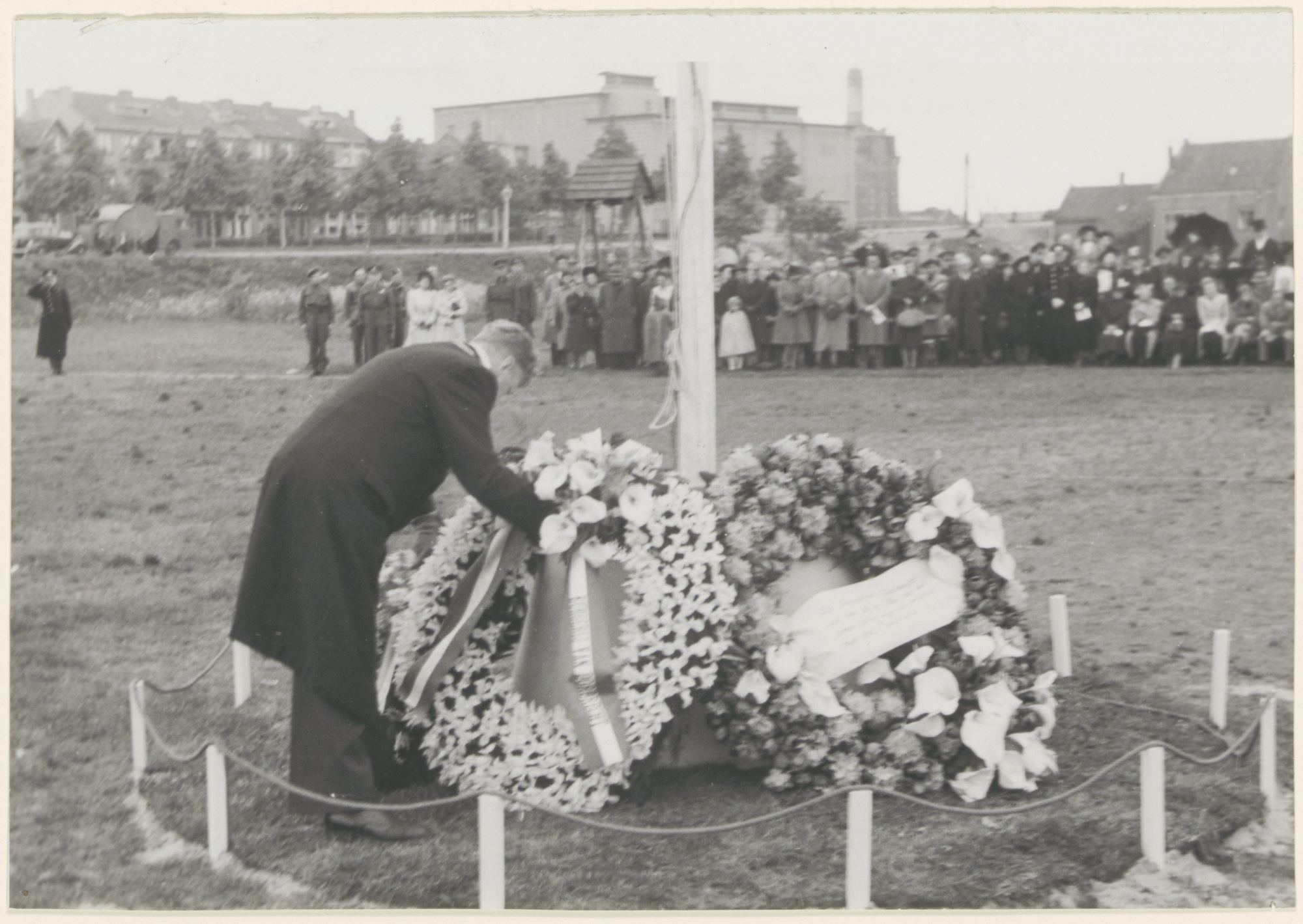 - Kranslegging door minister van oorlog Mr. J. Meynen bij de herdenking van de meidagen in 1940 tijdens een bijeenkomst en parade op het terrein voor Lichamelijke Opvoeding, op de hoek van de Oranjelaan en de Bankastraat. In het midden op de achtergrond het 150 kV-station van het GEB.