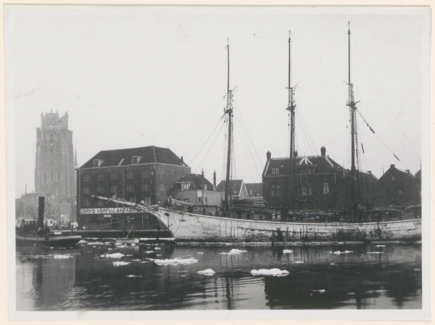 - Portugees smokkelschip afgemeerd op de Oude Maas langs de Buiten Kalkhavan. Links staat Pakhuis Vredenburg.