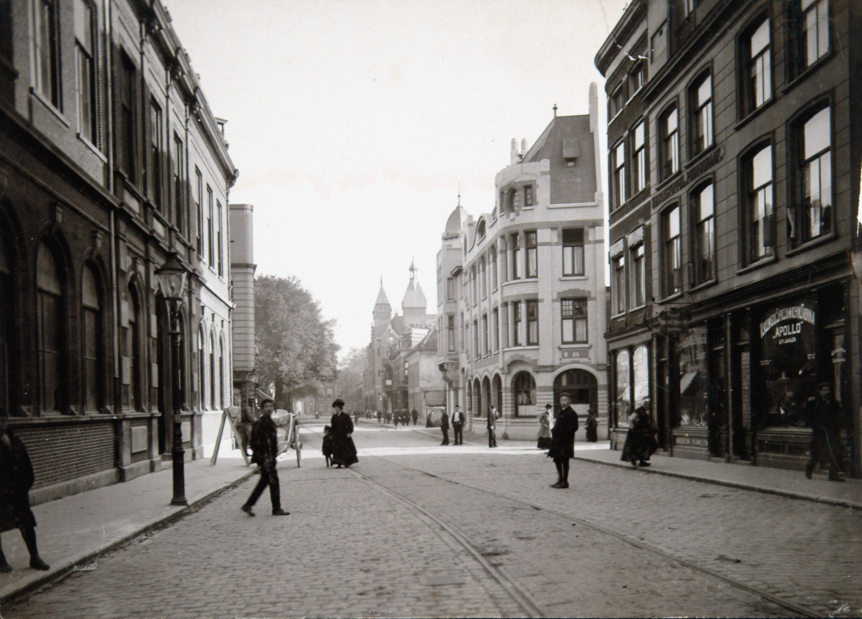 - De Visstraat richting Bagijnhof met de torentjes van het postkantoor op de achtergrond. De rails zijn van de paardentram. Links op de voorgrond een voormalig postkantoor, later kadaster en momenteel winkels.