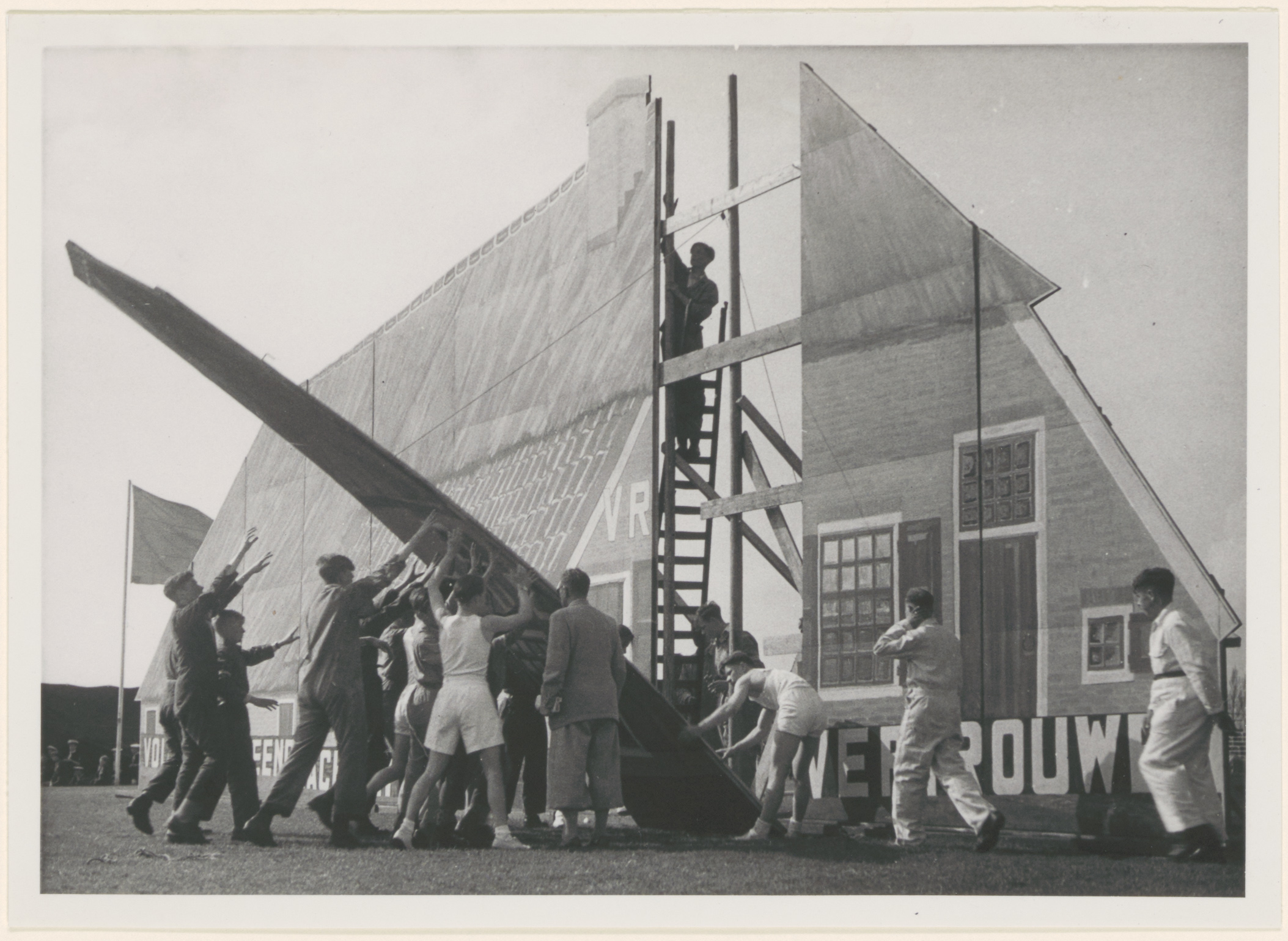 Bouw van het decor voor de opvoering van het bevrijdingsspel "In Holland staat een huis" tijdens de viering van de bevrijding.