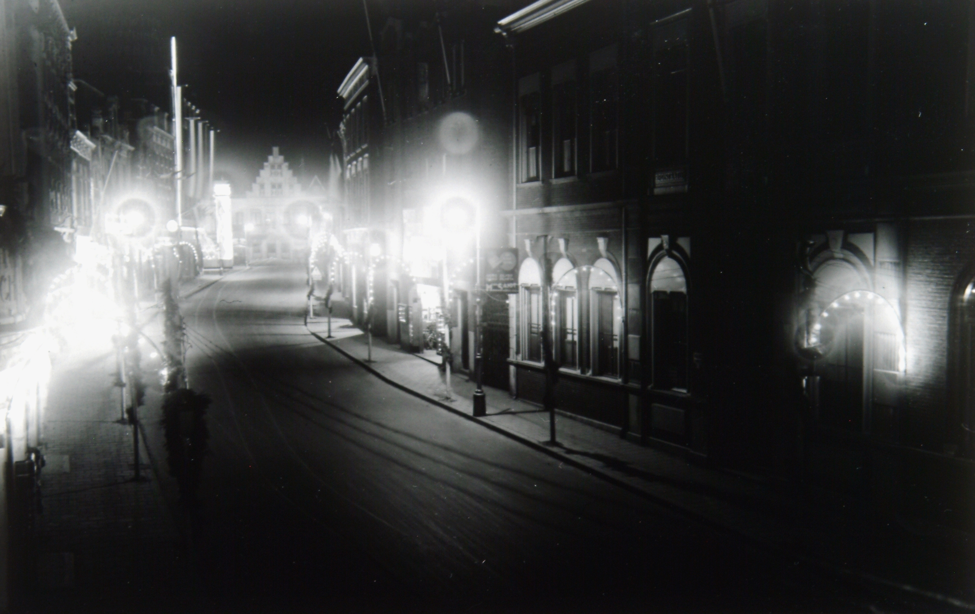 - De Visstraat in de richting van de Groenmarkt. De verlichting is t.g.v. de opening van de Moerdijkbrug.