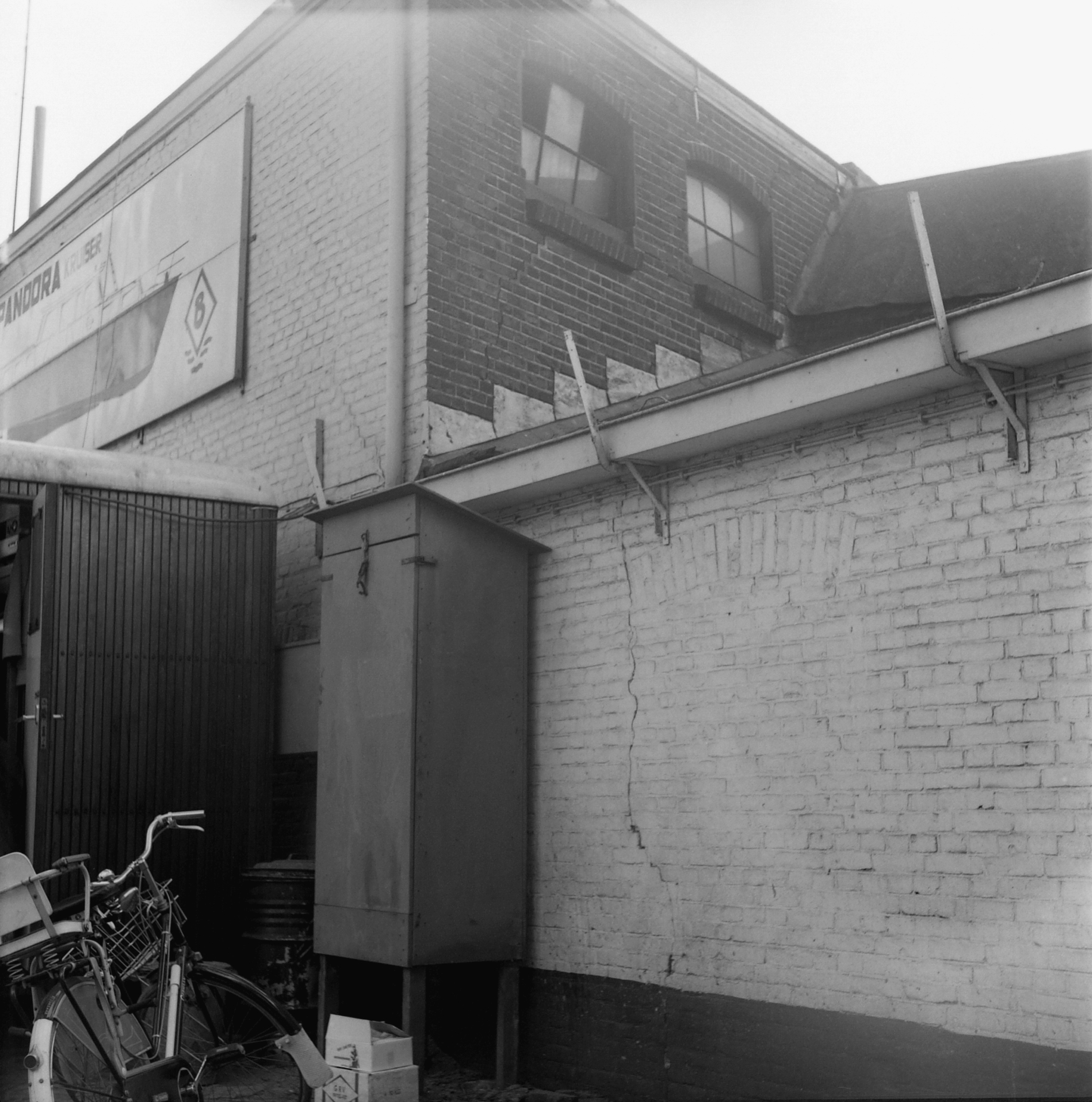 Links de achterkant van een patatwagen, mogelijk van Chris met de leus: "Patat van Chris, fijnste die er is!" De patatwagen staat met zijn voorkant richting brugwachterswoning aan de overkant van de kruising. Het rechtse witte pand en alles wat er achter lag is inmiddels afgebroken. Het linkse deel (nr 21) staat er nog, evenals nr 19 "De Loods", maar zullen waarschijnlijk ook wel ten onder gaan om plaats te maken voor de Stadswerven.