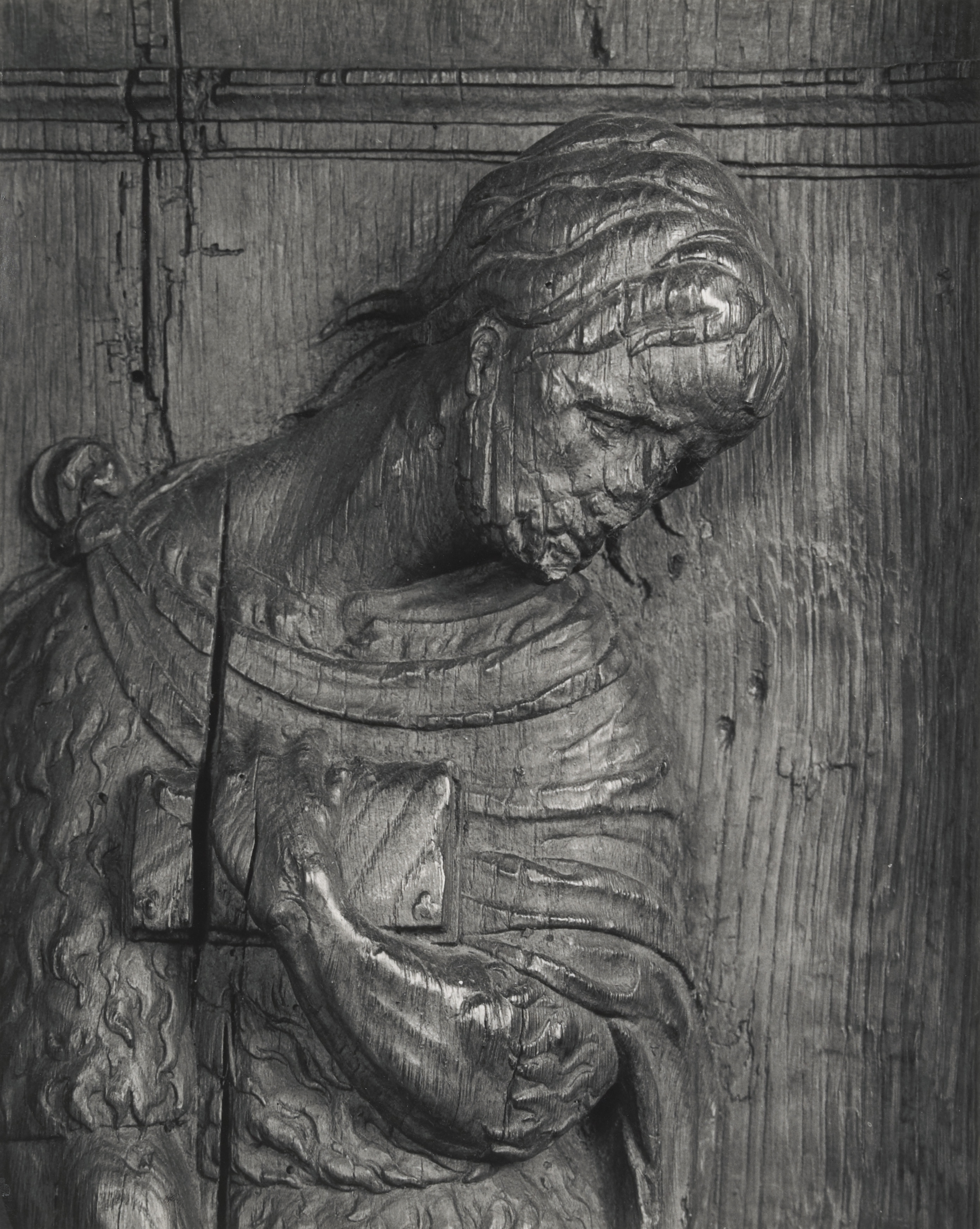 Menselijke figuren in het houtsnijwerk van de koorbanken in de Grote Kerk.