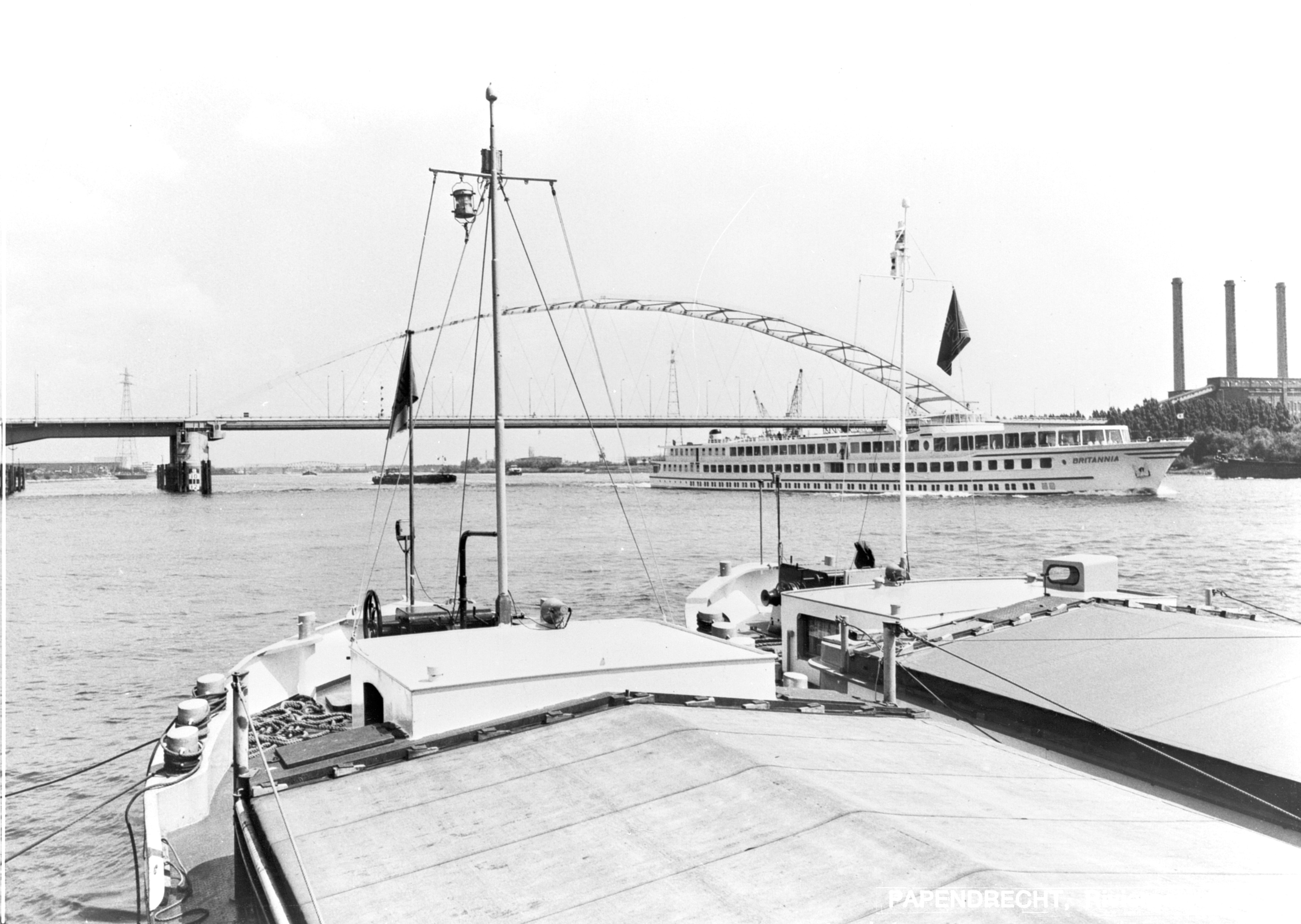 - De Papendrechtse brug over de Beneden Merwede. De schoorstenen zijn van de Merwedecentrale.