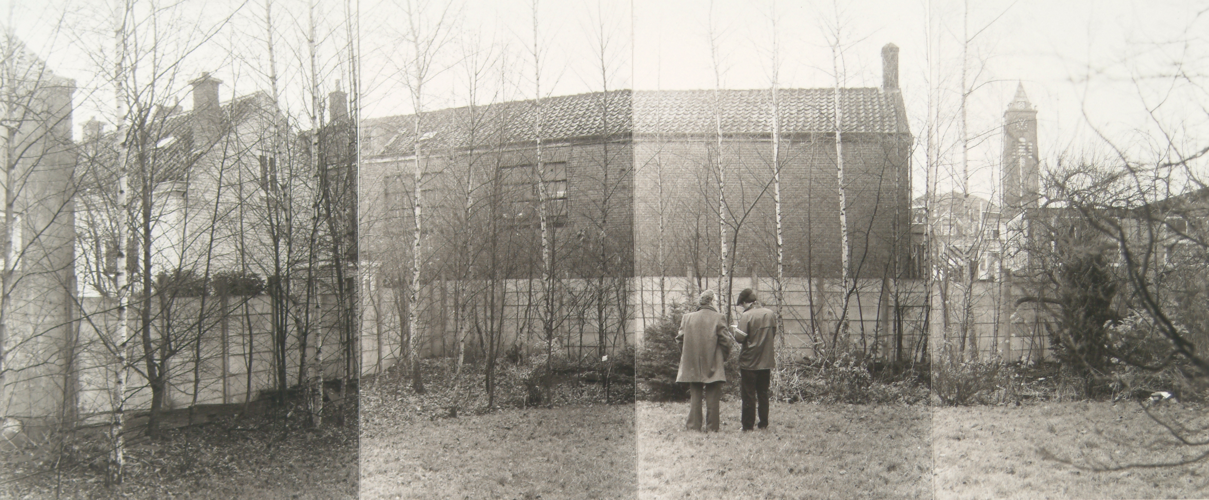 - Collage van 4 opnames van de achtertuin van het Clara en Mariahof aan de Vrieseweg met op de achtergrond de Wilhelminakerk aan de Blekersdijk
