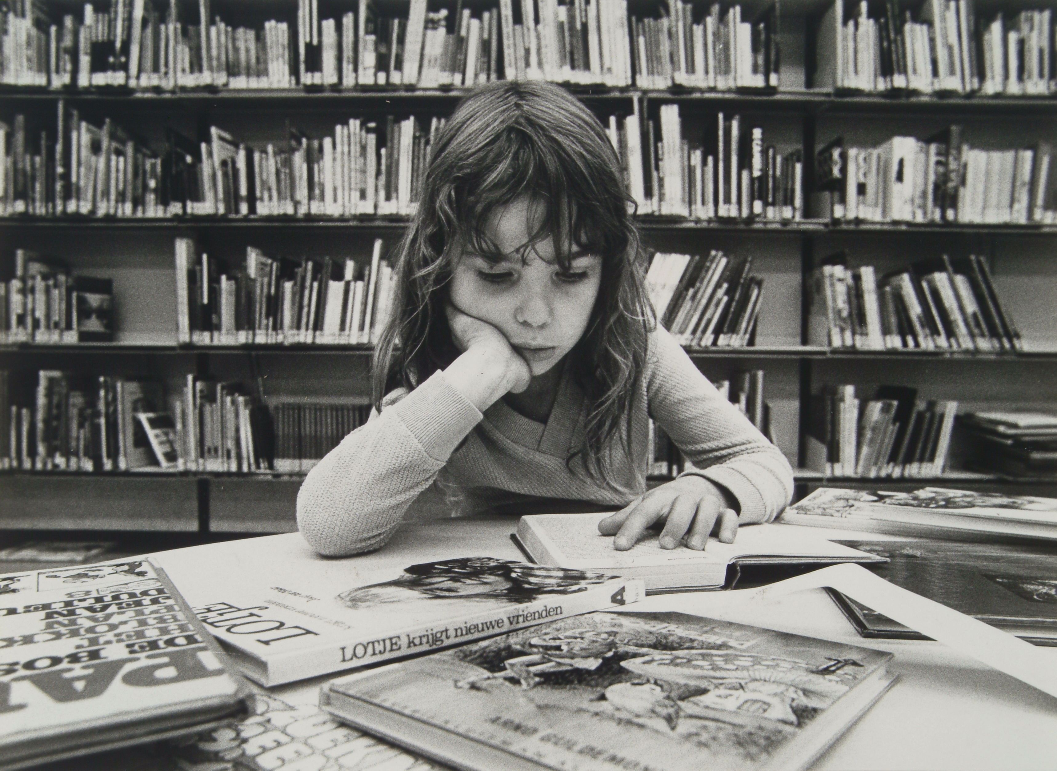 - Meisje leest een boek in de bibliotheek aan het Achterom