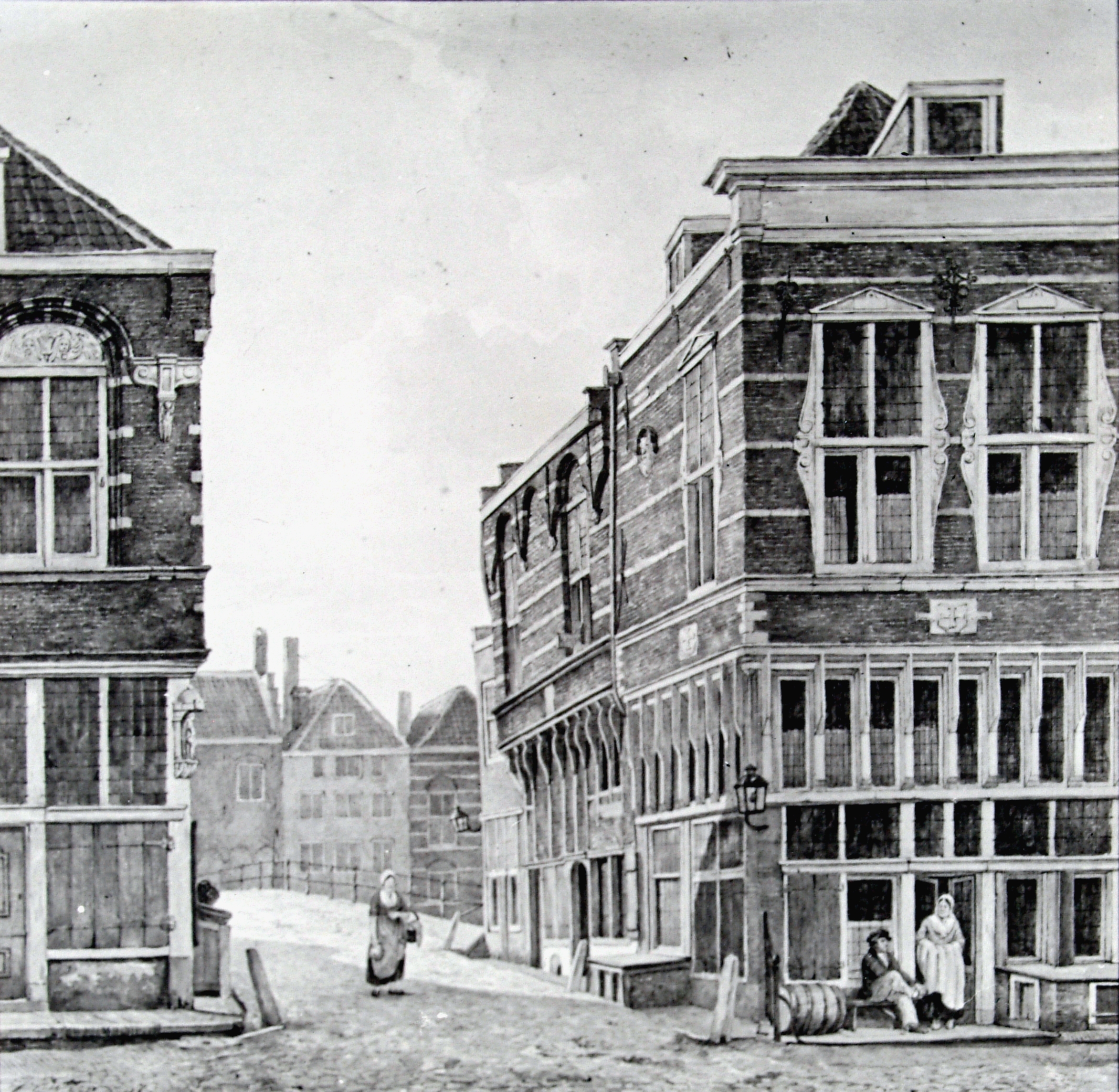 De huizen Samson en 't Cruijs aan de Nieuwbrug, hoek Voorstraat. De panden zijn afgebroken in 1847. Tekening in kleur door J. Rutten (37,5x39 cm)