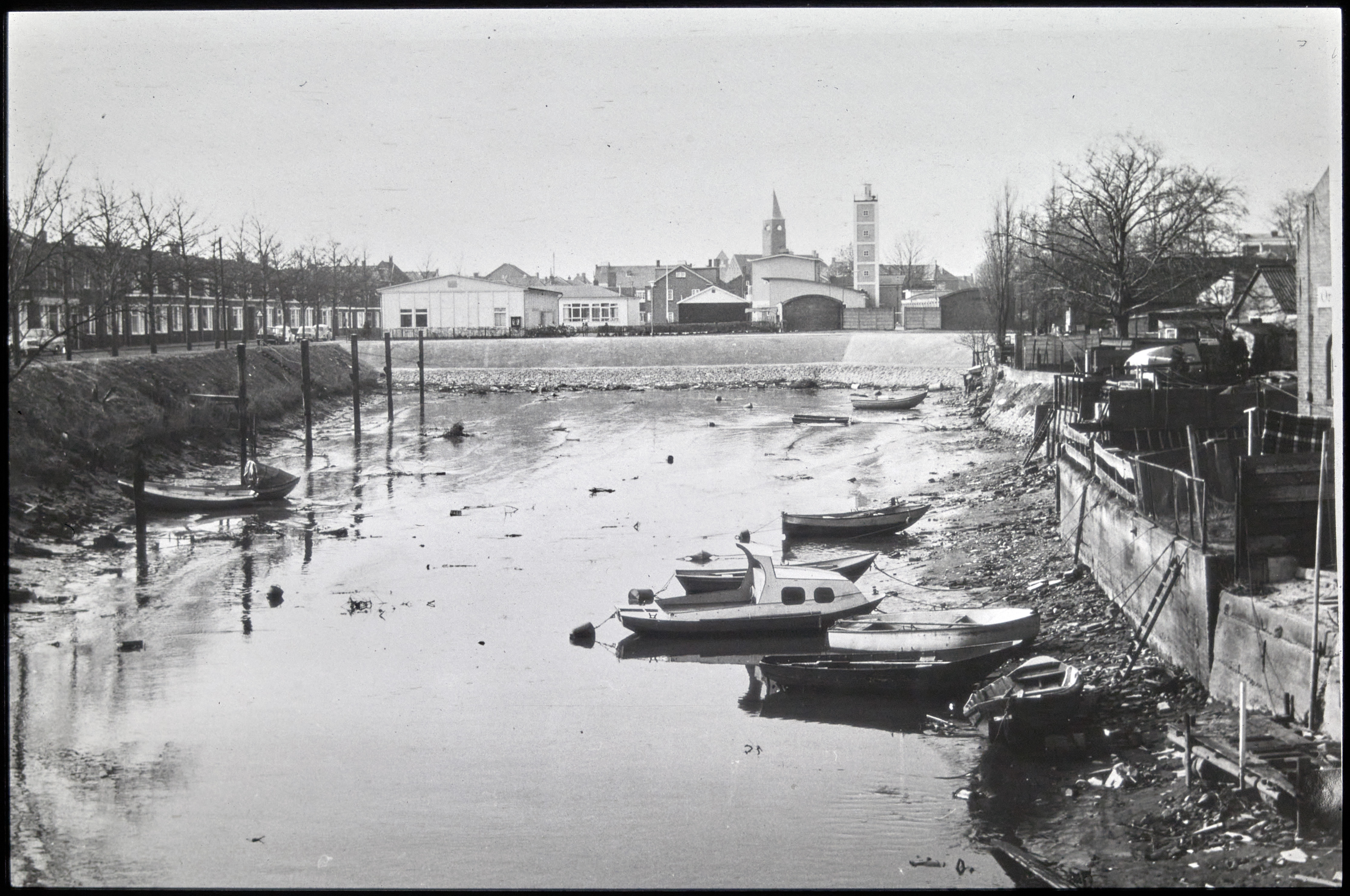 Vanaf de Oosterbrug over het Middeldiep met op de achtergrond de brandweer kazerne van de Gemeente Sliedrecht met de Gereformeerde Kerk.