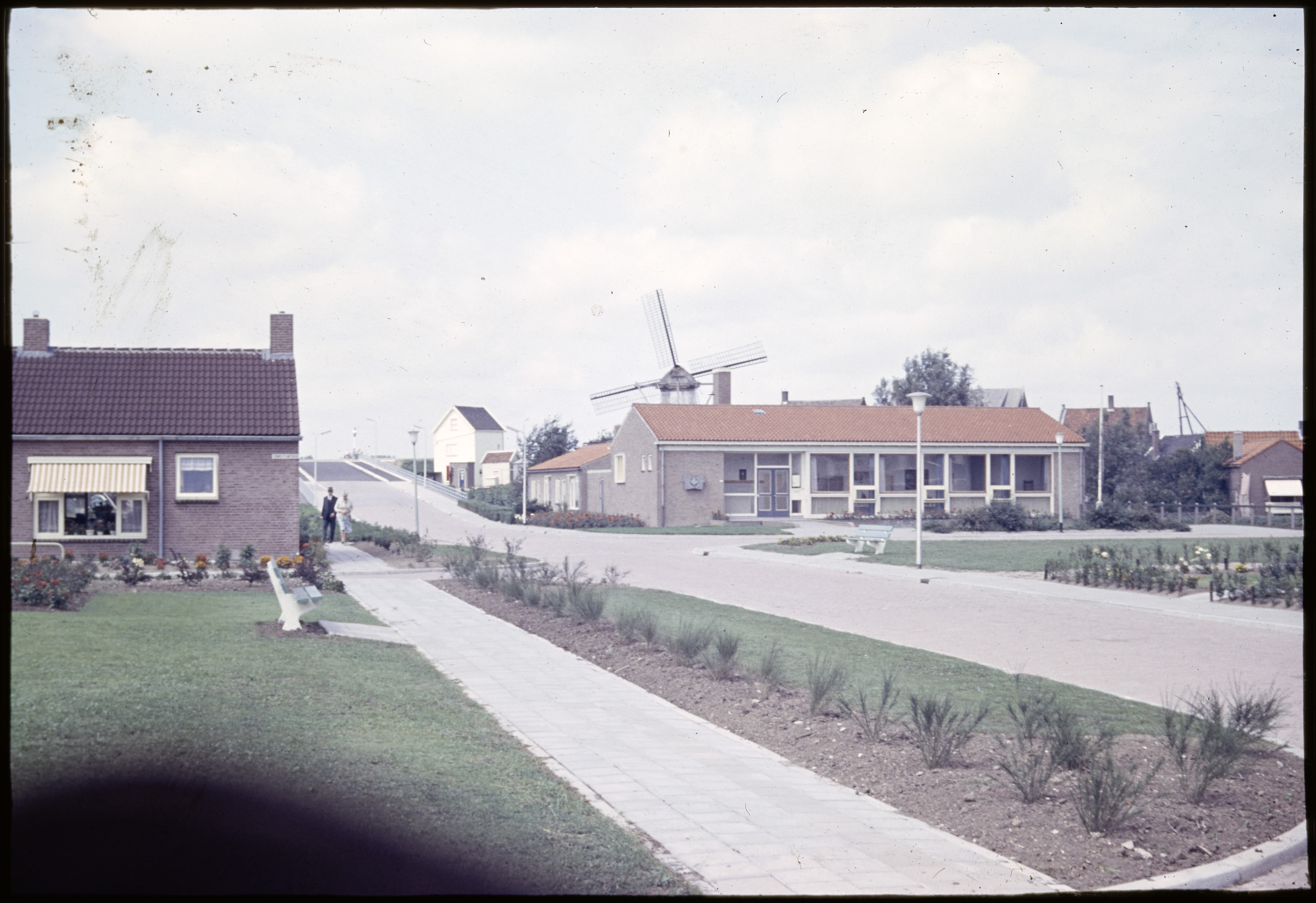 Hoogaarslaan thv Grondelplantsoen richting van de Lekdijk met zicht op het Groene Kruis gebouw en molen "De Regt"in Nieuw Lekkerland.
