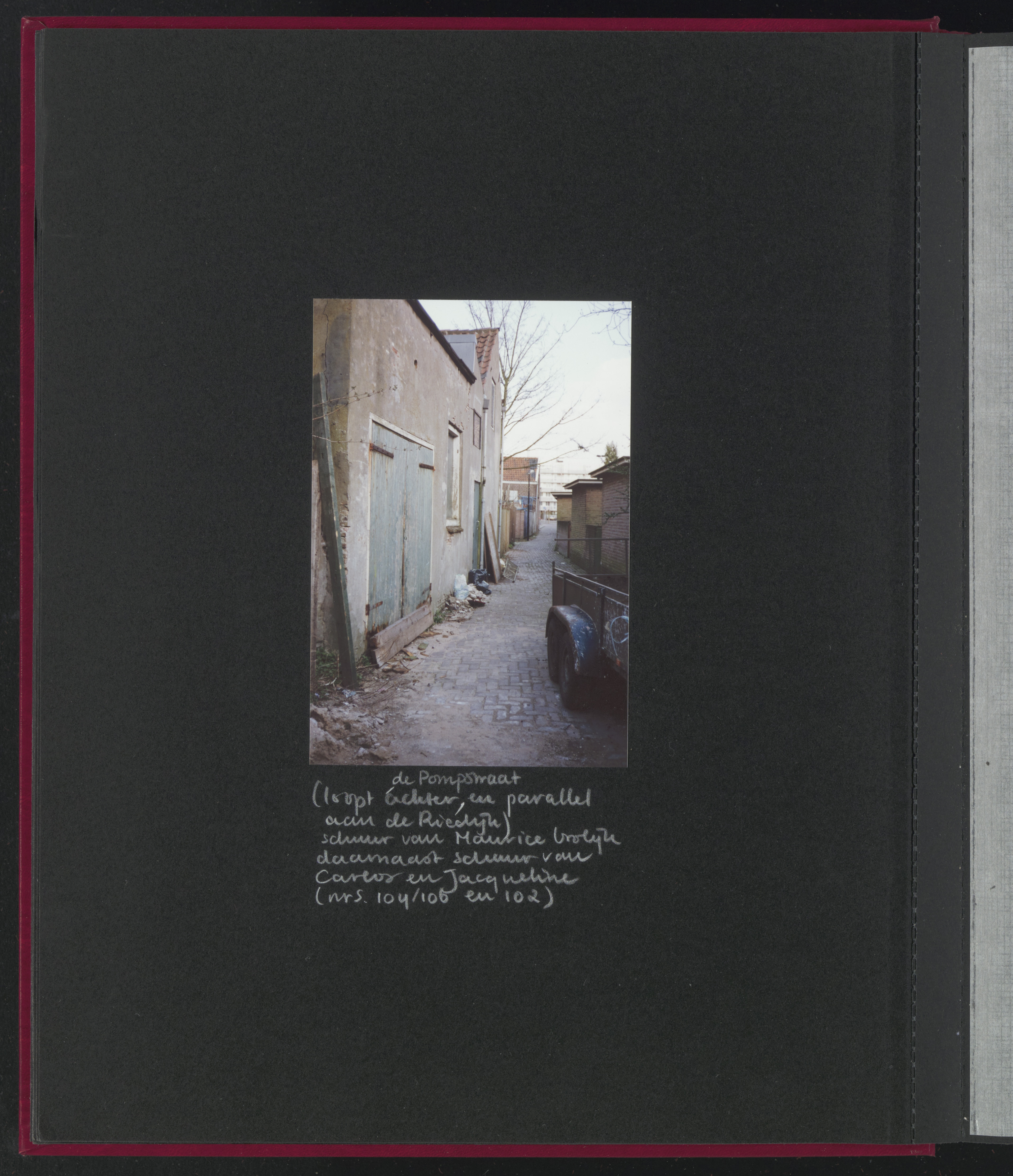 (Anna Pool, Album 'Riedijk') de Pompstraat (loopt achter en parallel aan de Riedijk) schuur van Maurice Vrolijk, daarnaast schuur van Carlos en Jaqueline (nrs. 104/106 en 102))