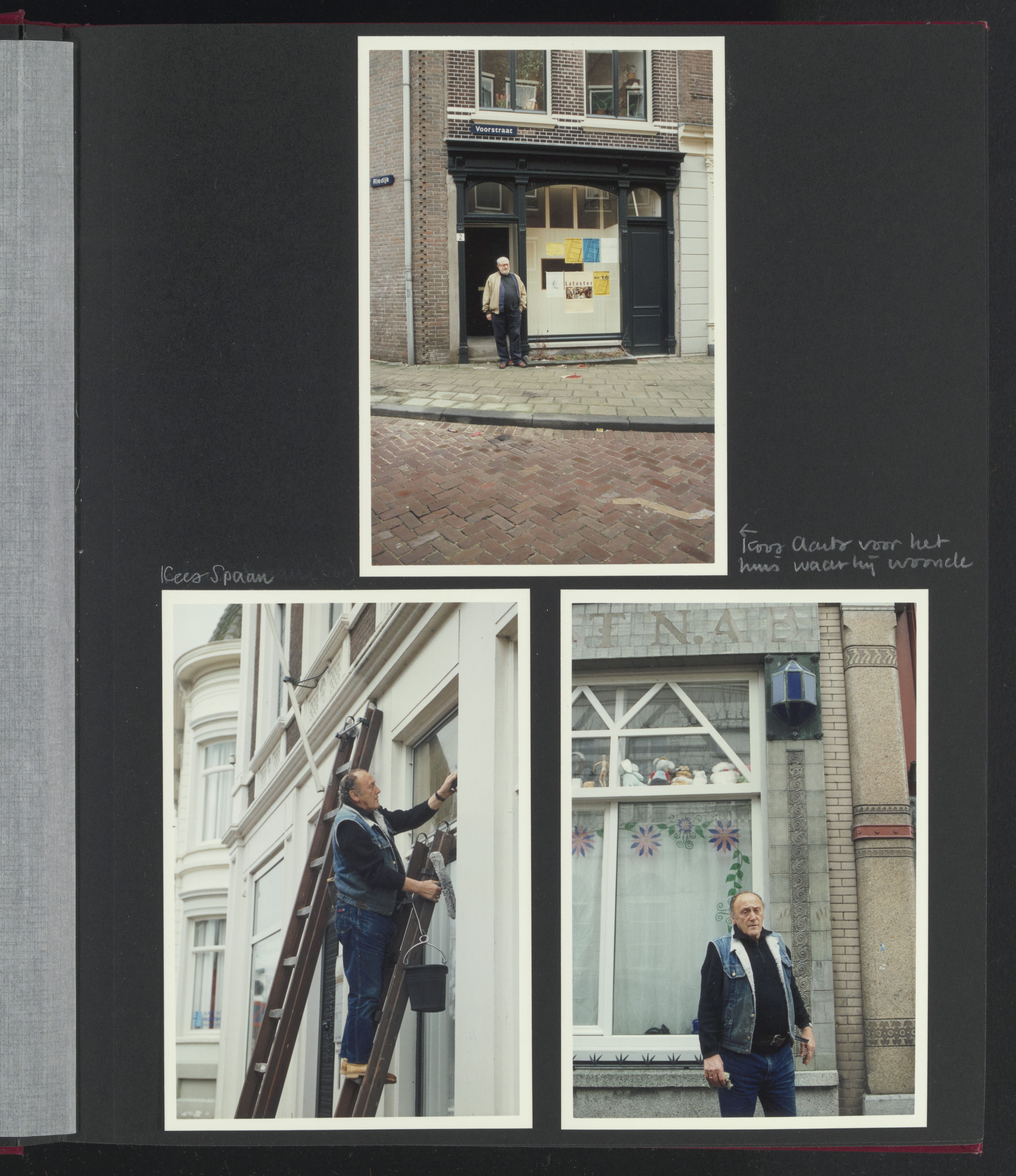 Rechtsonder lapt Kees Spaan de ramen van Steegoversloot 145 en linksonder die van 275, met uitzicht op het andere hoekpand Steegoversloot/Vest. Periode 1976-1981.