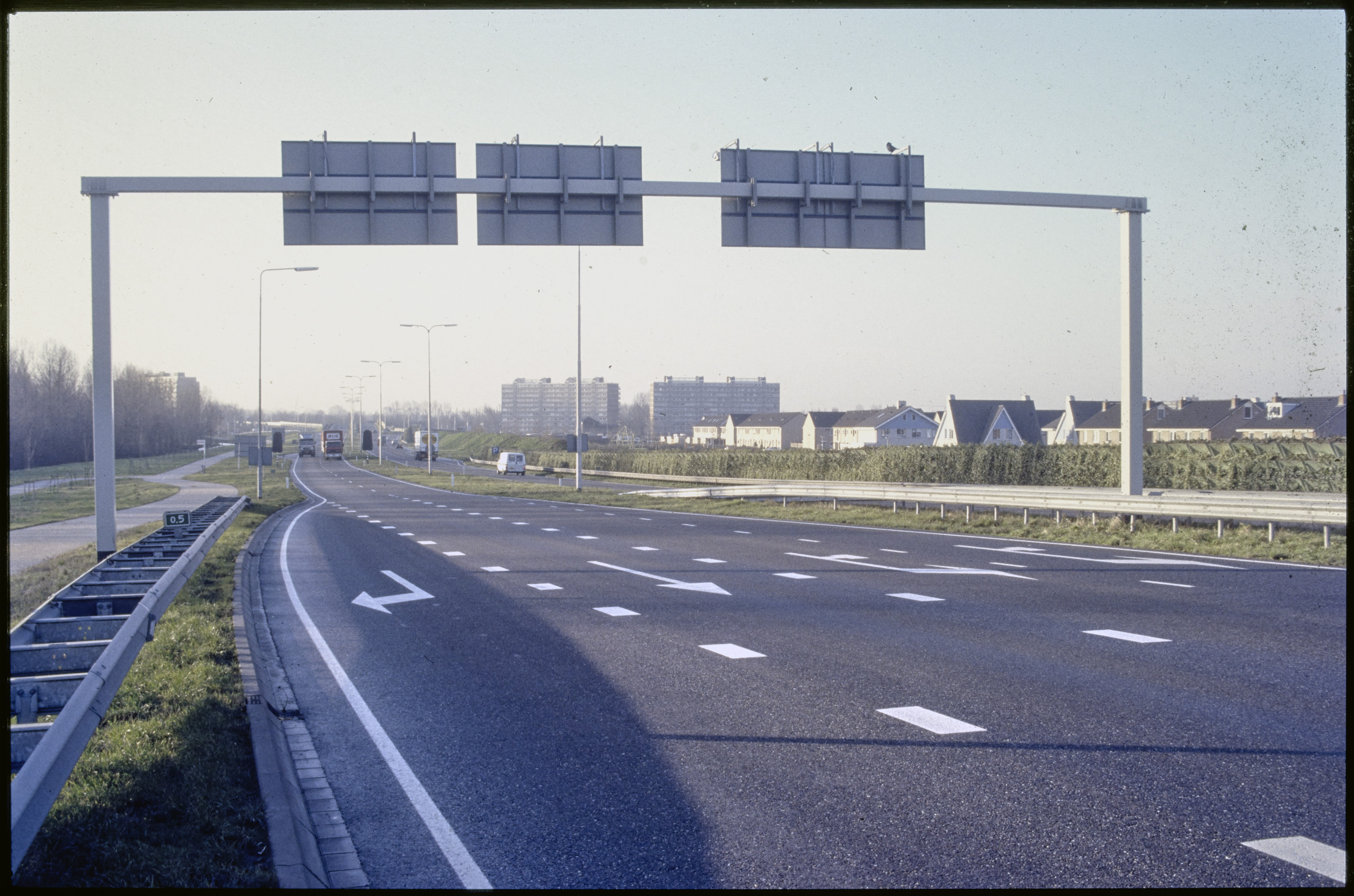 Rondweg N3 richting de Merwedebrug gezien vanaf de A15. Rechts twee flats aan de P.J.Oudstraat en links de flat aan de Zernikelaan in Papendrecht.