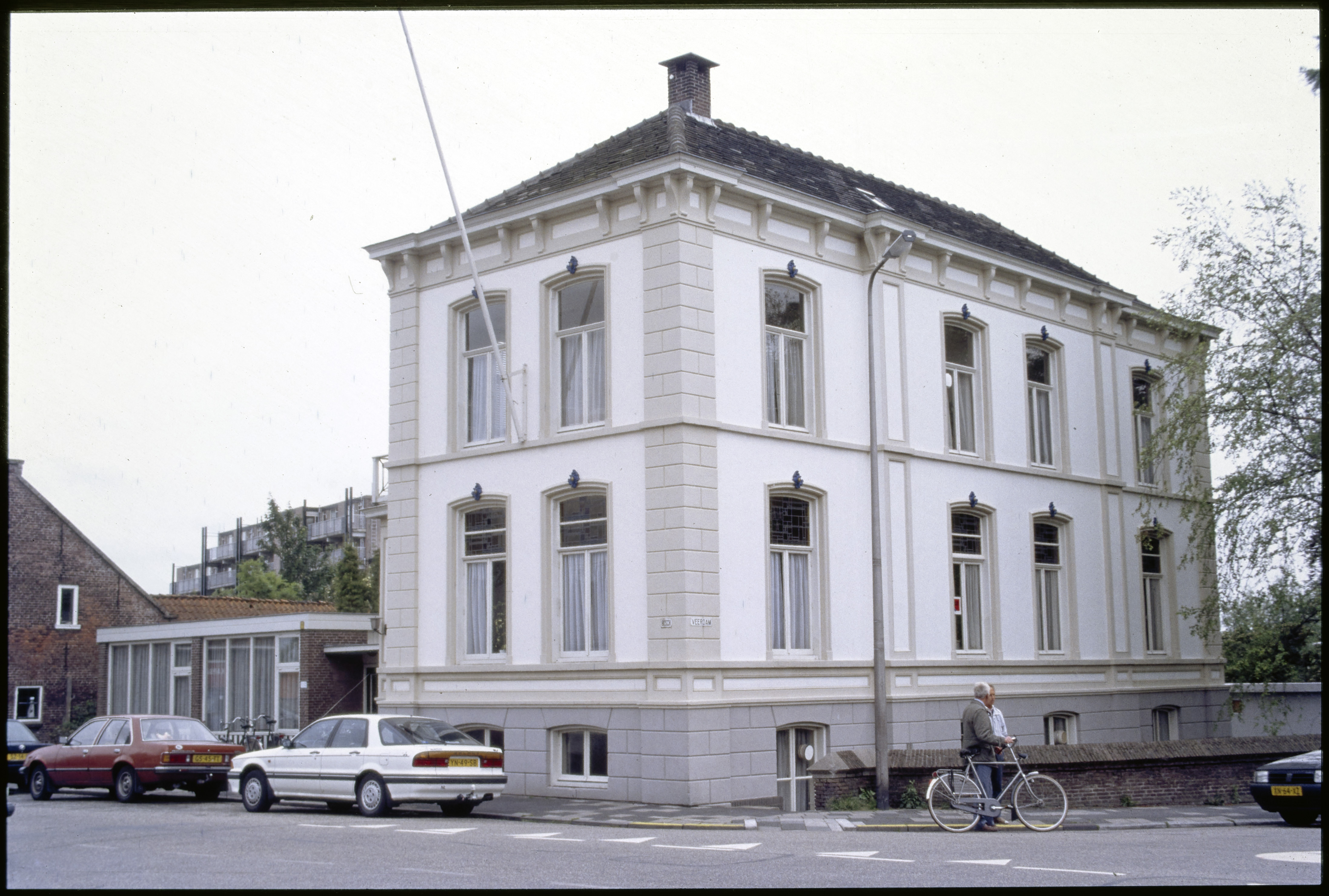 Kantoor van Gemeentewerken op de hoek Veerdam / Bosch (voorgrond) in Papendrecht.